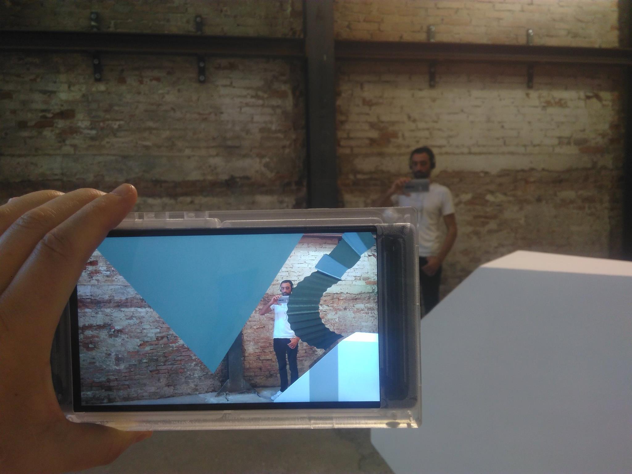 Blind Sculpture est une œuvre composite avec dans l’espace d’exposition une forme « balise » ainsi qu’un dispositif mobile audiovisuel. Un système de localisation tridimensionnelle intégré permet de percevoir les géométries cachées de formes digitales. Le spectateur, muni d’une tablette et d’un casque audio se déplace dans un environnement de réalité mixte où scène digitale et “réelle” sont parfaitement imbriquées.
