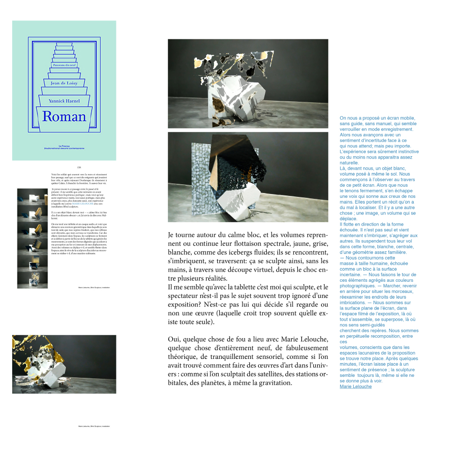 Cette œuvre hybride basée sur des scans tridimensionnels est une sculpture postdigitale composée d’une forme présente de manière constante et d’autres qui semblent toujours cheminées vers elle. Elle s’inscrit dans l’espace et la temporalité de l’exposition au fil du déplacement du spectateur, rythmée par un récit entre descriptions formelles et subjectivités mêlées.