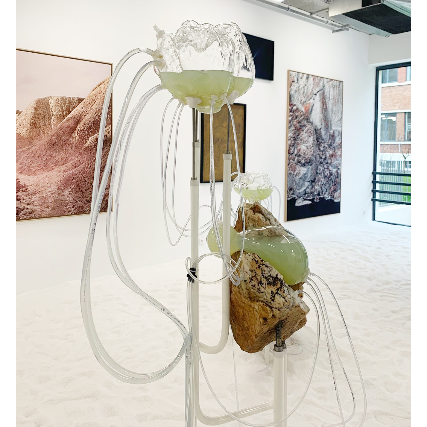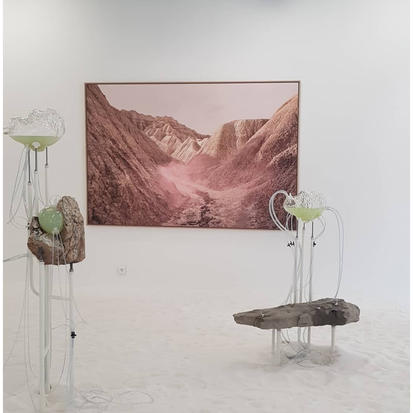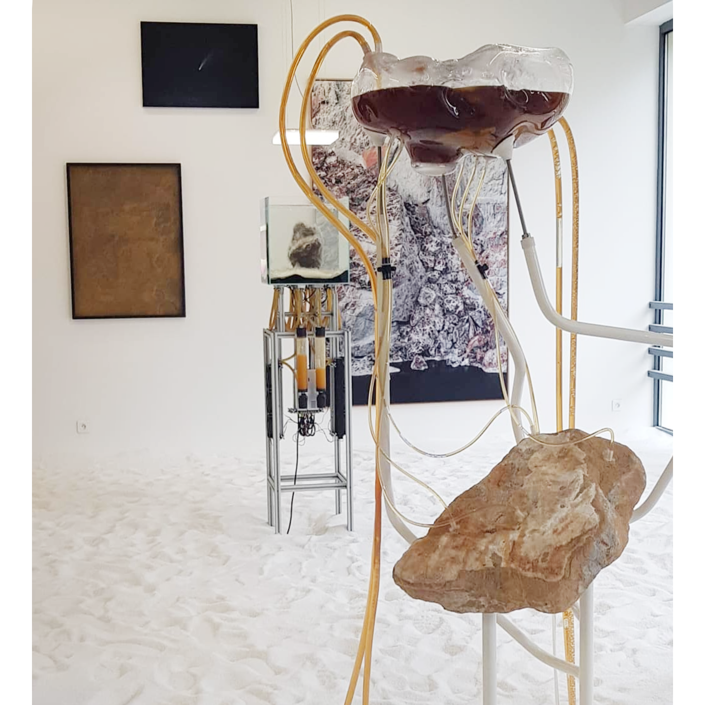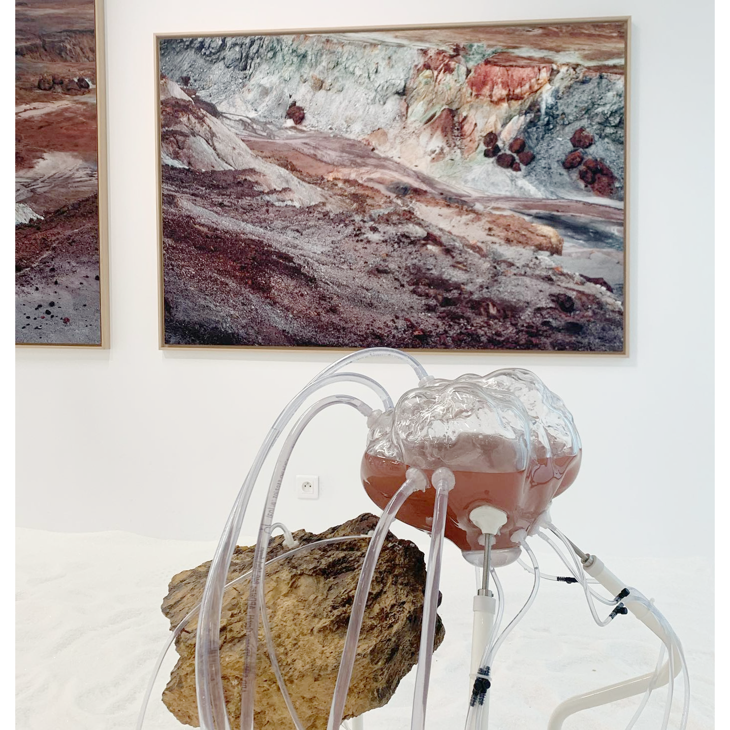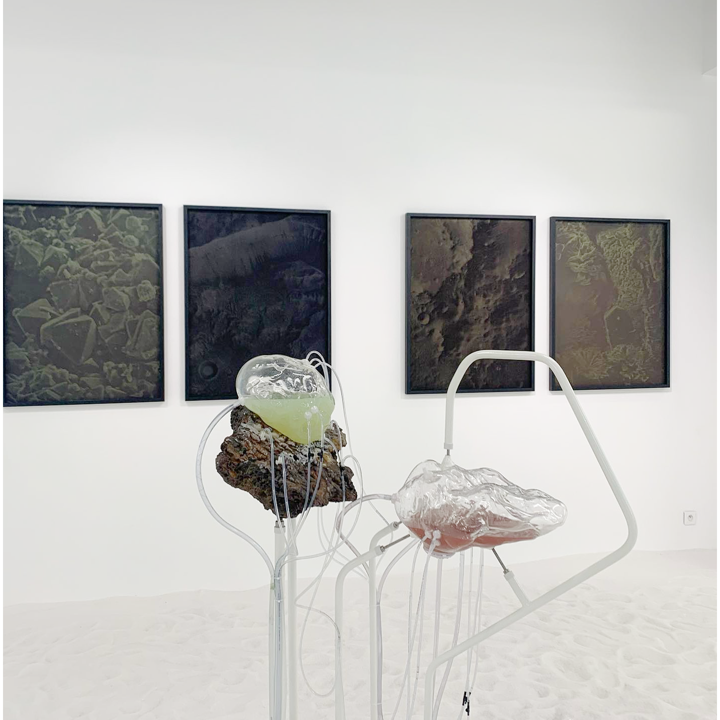 À travers des dispositifs qui permettent aux matériaux récoltés par l’artiste lors de ses explorations de se rencontrer et d’interagir, des processus de croissance, de cristallisation, de développement, de transformation ou de dégradation rejouent, durant le temps de l’exposition, des phénomènes géologiques et chimiques qui s’établissent d’ordinaire à des échelles de temps immémoriales.