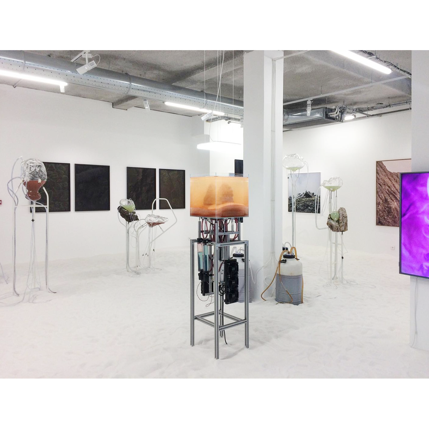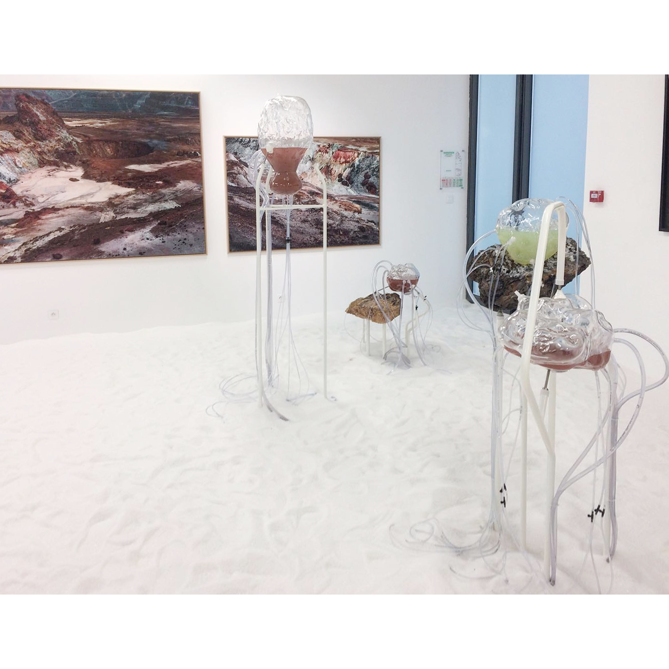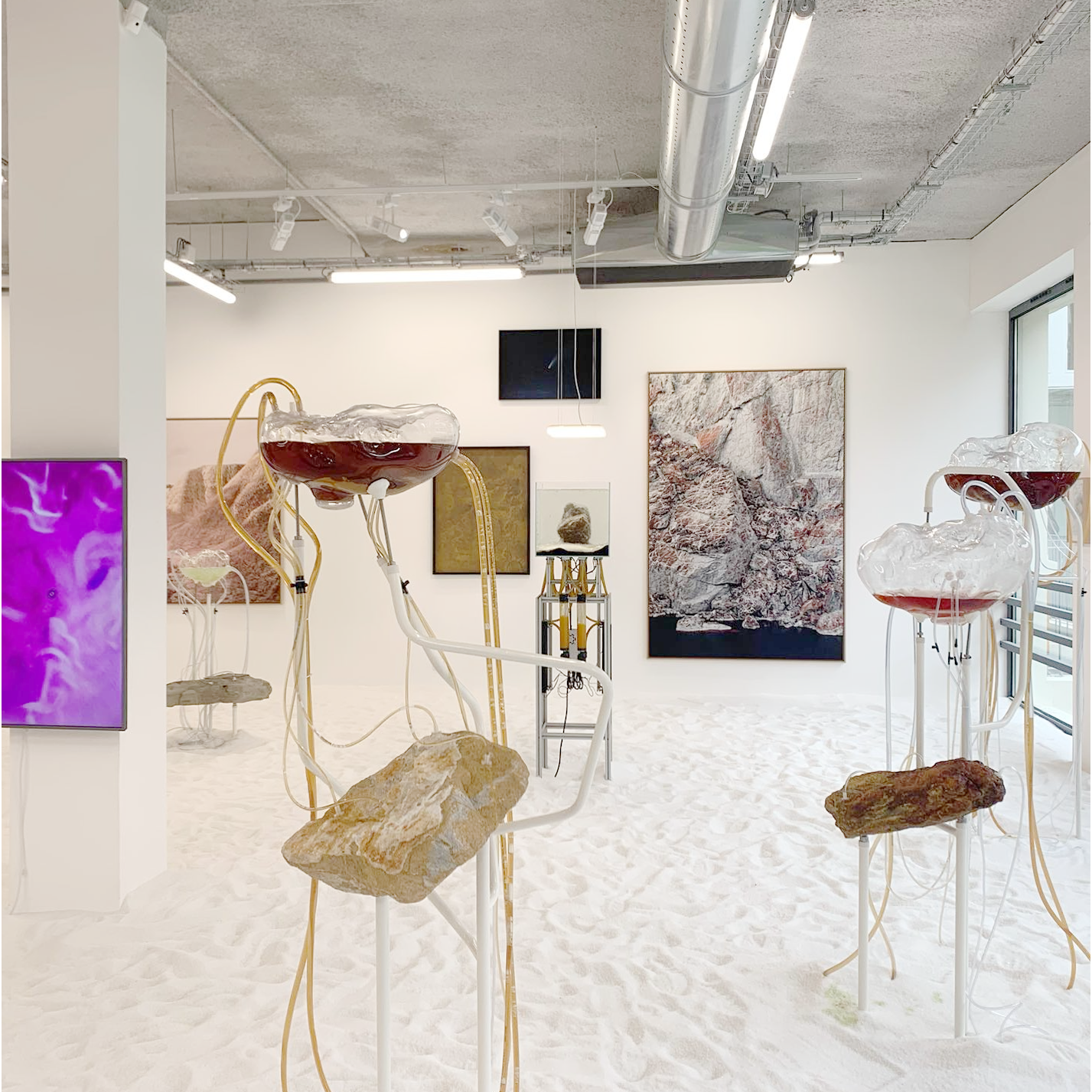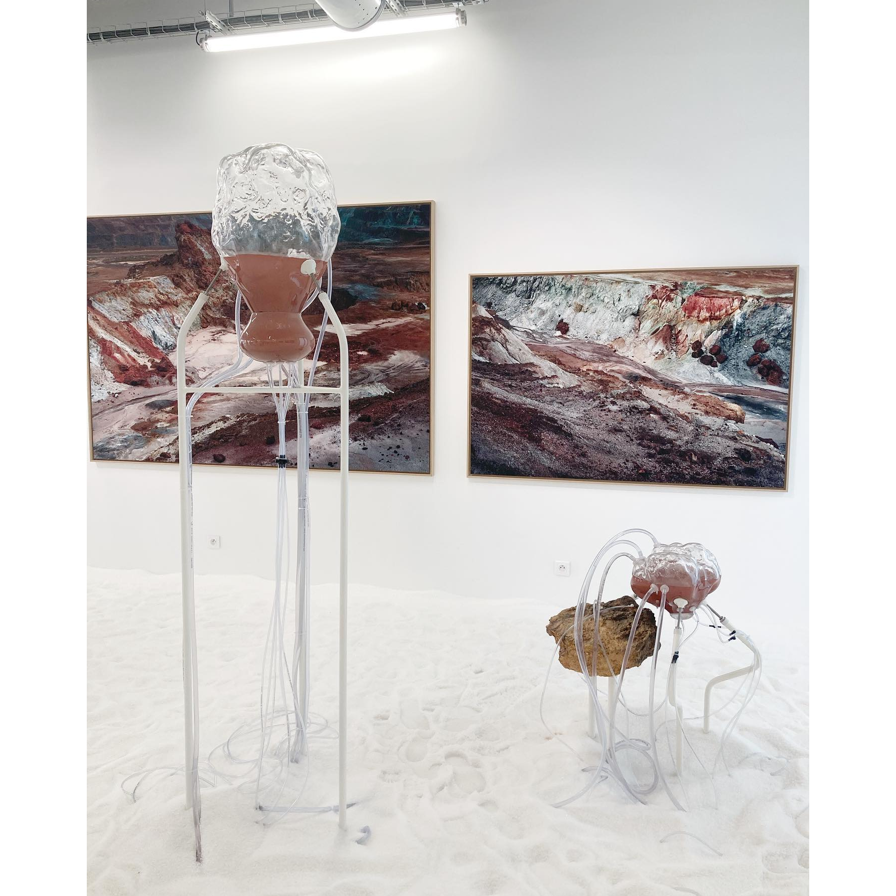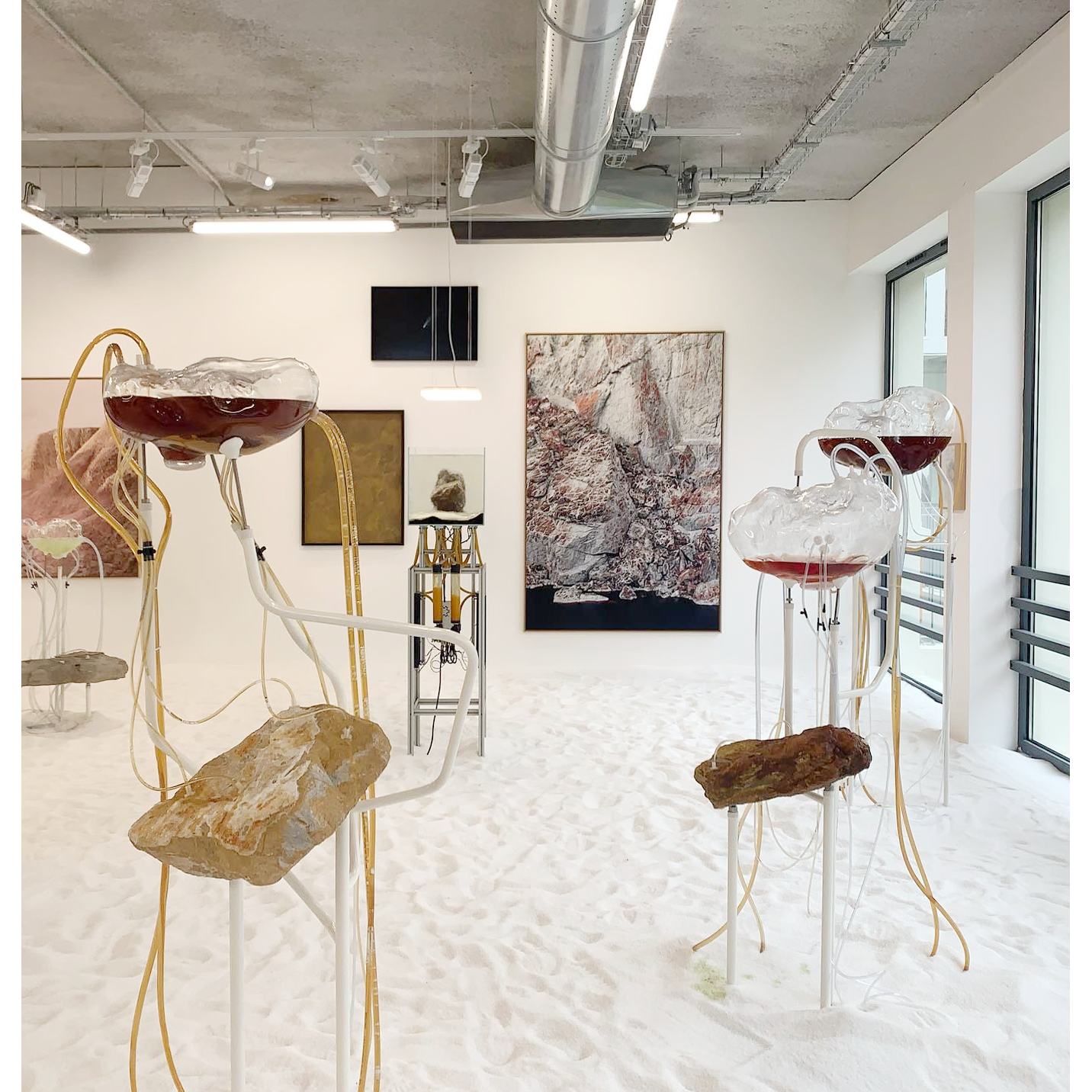 À travers des dispositifs qui permettent aux matériaux récoltés par l’artiste lors de ses explorations de se rencontrer et d’interagir, des processus de croissance, de cristallisation, de développement, de transformation ou de dégradation rejouent, durant le temps de l’exposition, des phénomènes géologiques et chimiques qui s’établissent d’ordinaire à des échelles de temps immémoriales.