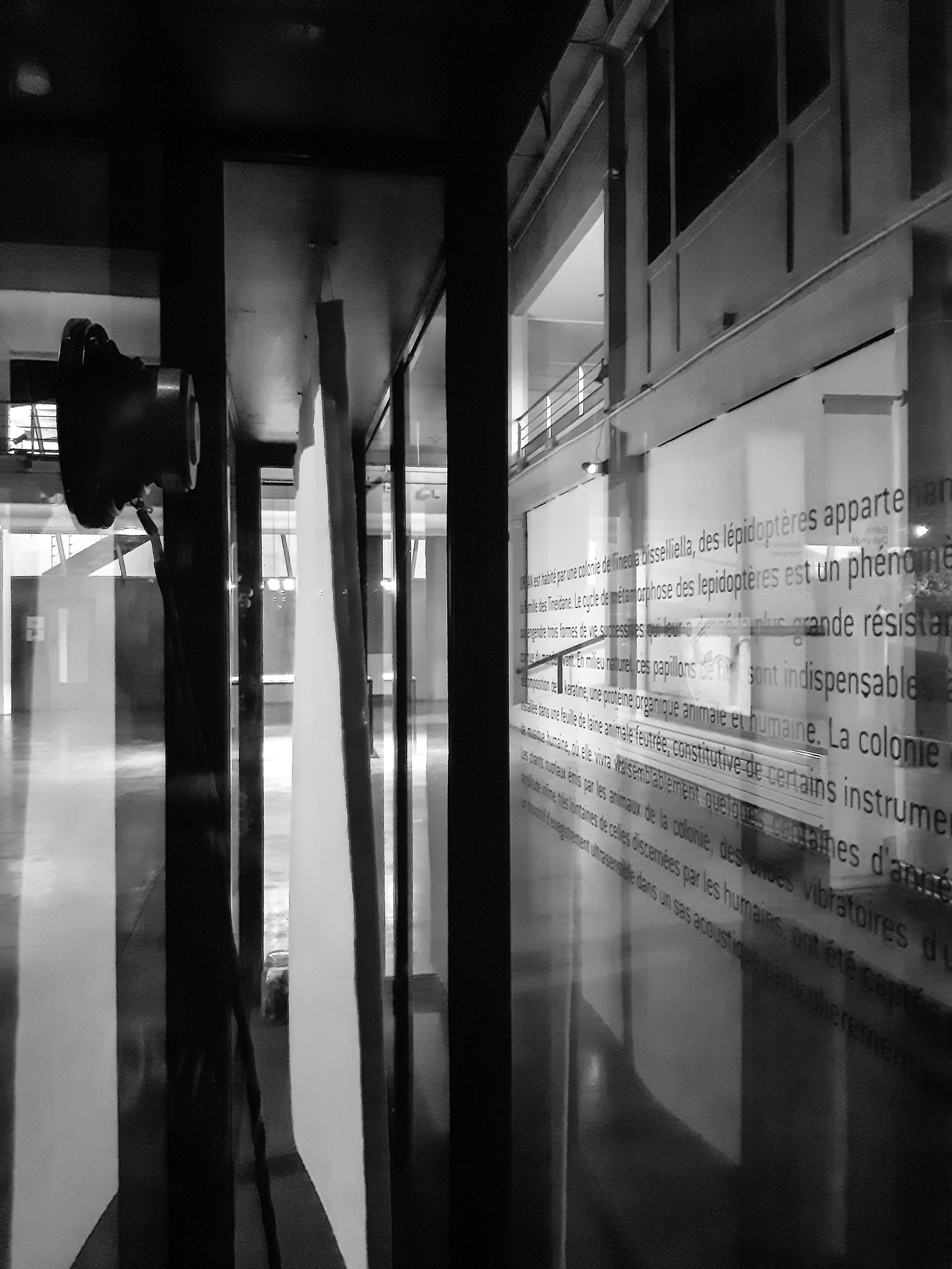 L’improbable stratégie de viabilité que les larves aménagent à leur endroit et à leur rythme entretient un foyer qui défie la fonction de veille préventive que se sont inventée les utopies sociales de la modernité dans la transparence vitrée. Le dispositif ne fait qu’intensifier la puissante déficience d’un imago qui agit par manquement aux spéculations du prévisible et de l’audible qu’est censé permettre l’appareillage.