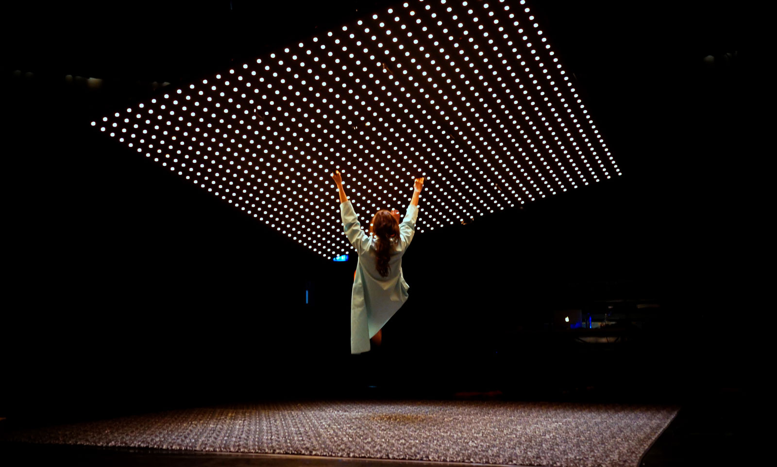 Quatre personnes, une danseuse, un circassien, un musicien et une éclairagiste sont dans l’espace. Sous un plafond lumineux qui est à la fois dispositif scénique, agrès de cirque et espace de jeu, ils évoluent, créent, dansent très près des spectateurs installés tout autour.