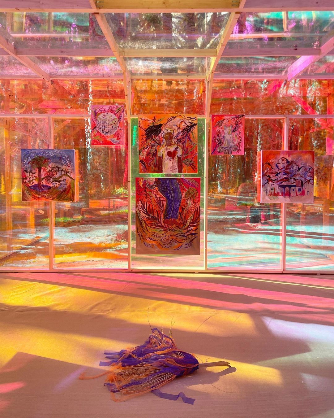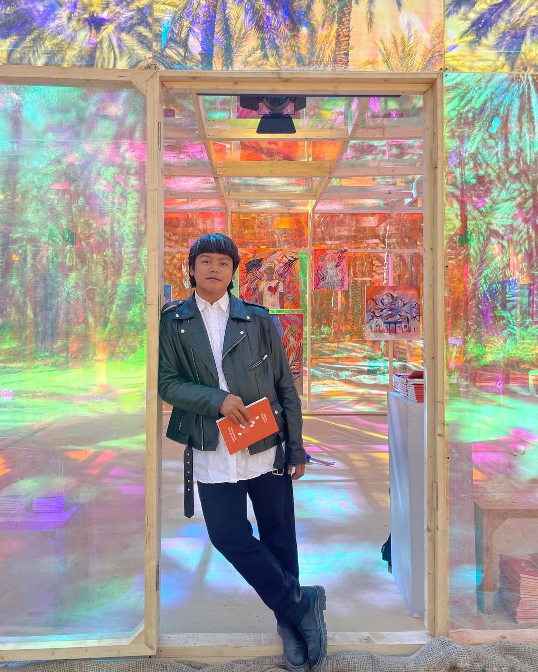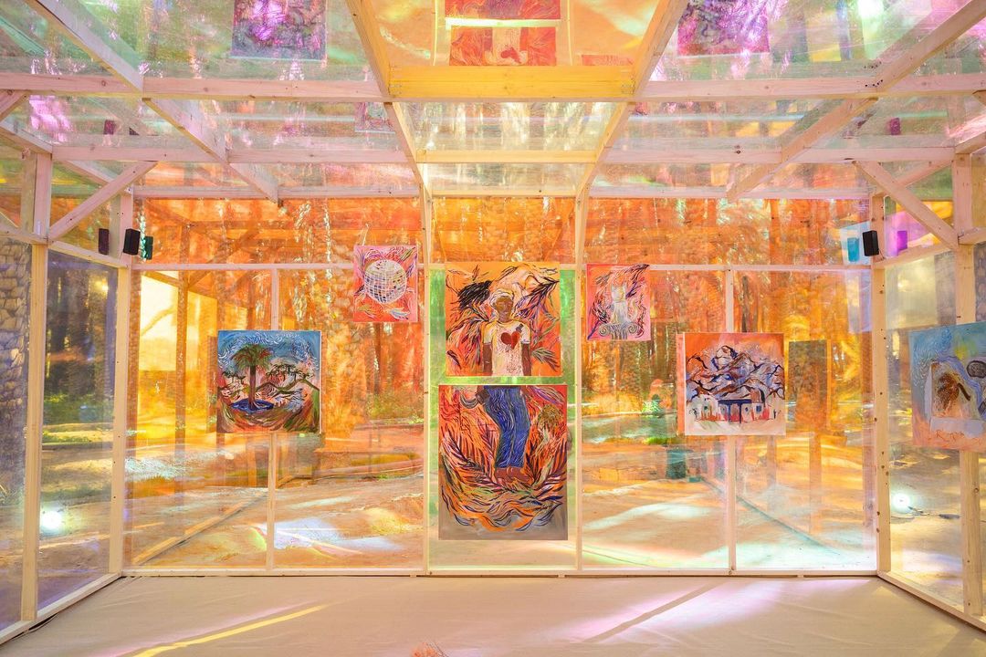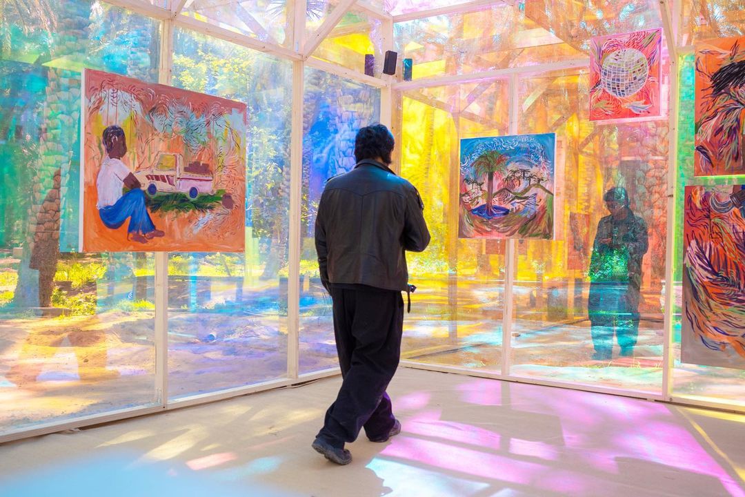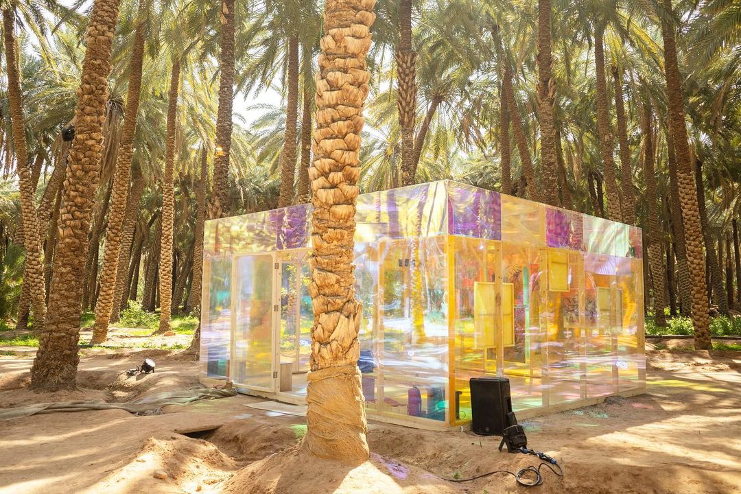 ‘The Bitter Taste of Sweetness’ is a varied body of work that tells us with candour: the sweetness of dates carries the burden and bitterness of their harvest. By going back and forth between his writing work and the various other disciplines he practises (painting, photography, publication, musical creation, and performance), Augustine Paredes deploys his narration through a multiplicity of objects. Integral to the work is a first-person story about a farmer-labourer hired by a farm owner looking to tend to his trees and harvest their dates. This story, where realistic and fantastic notes are mixed, is accompanied by a collection of poetry written from three perspectives: the universe’s, the palm tree’s, and the farmer’s. Both are central elements of the zine published by the artist, and are also the common thread to the set of shimmering paintings that he presents in a crystalline pavilion in the palm grove of Mabiti AlUla. The paintings illustrate the scenes and characters of the farmer-labourer’s story and yet digress from it to become images that convey their own independent narratives. The inside of Augustine Paredes’s pavilion is bathed in the sounds of his poems, transformed into electronic lullabies that he composed throughout the residency.