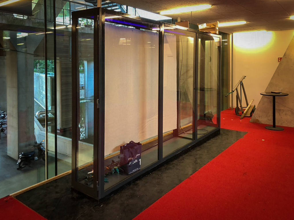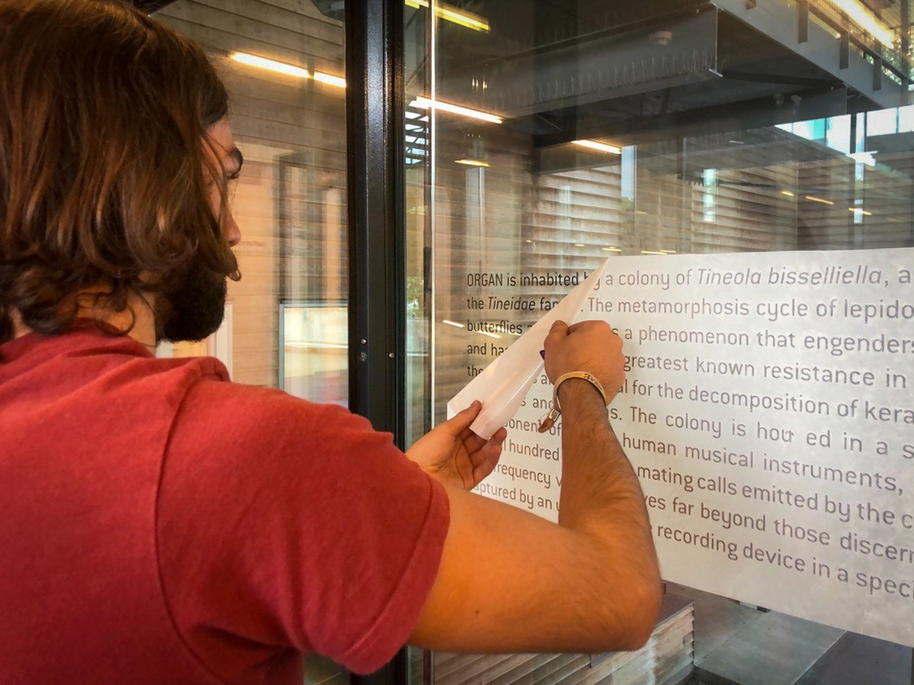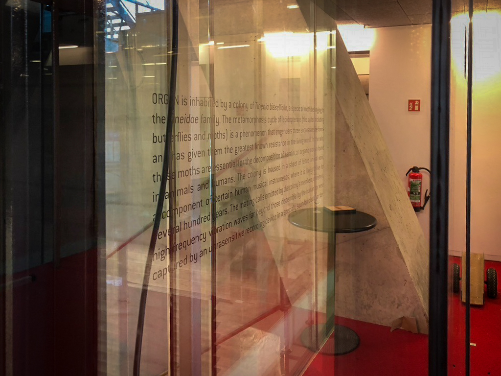Entre ses parois vitrées, ORGAN accueille des Tineola bisselliella, lépidoptères appartenant à la famille des Tineidae, plus communément appelés mites. Elles y ont engagé avec la laine animale, matériau complice à leur perpétuation, une étreinte dévorante qui durera, aux dires des scientifiques, des centaines d’années. Les chants nuptiaux émis par la colonie, des ondes vibratoires d’une amplitude infime, très lointaines de celles discernées par les humains, ont été captés par un dispositif d’enregistrement ultrasensible dans un sas acoustique particulièrement isolé.