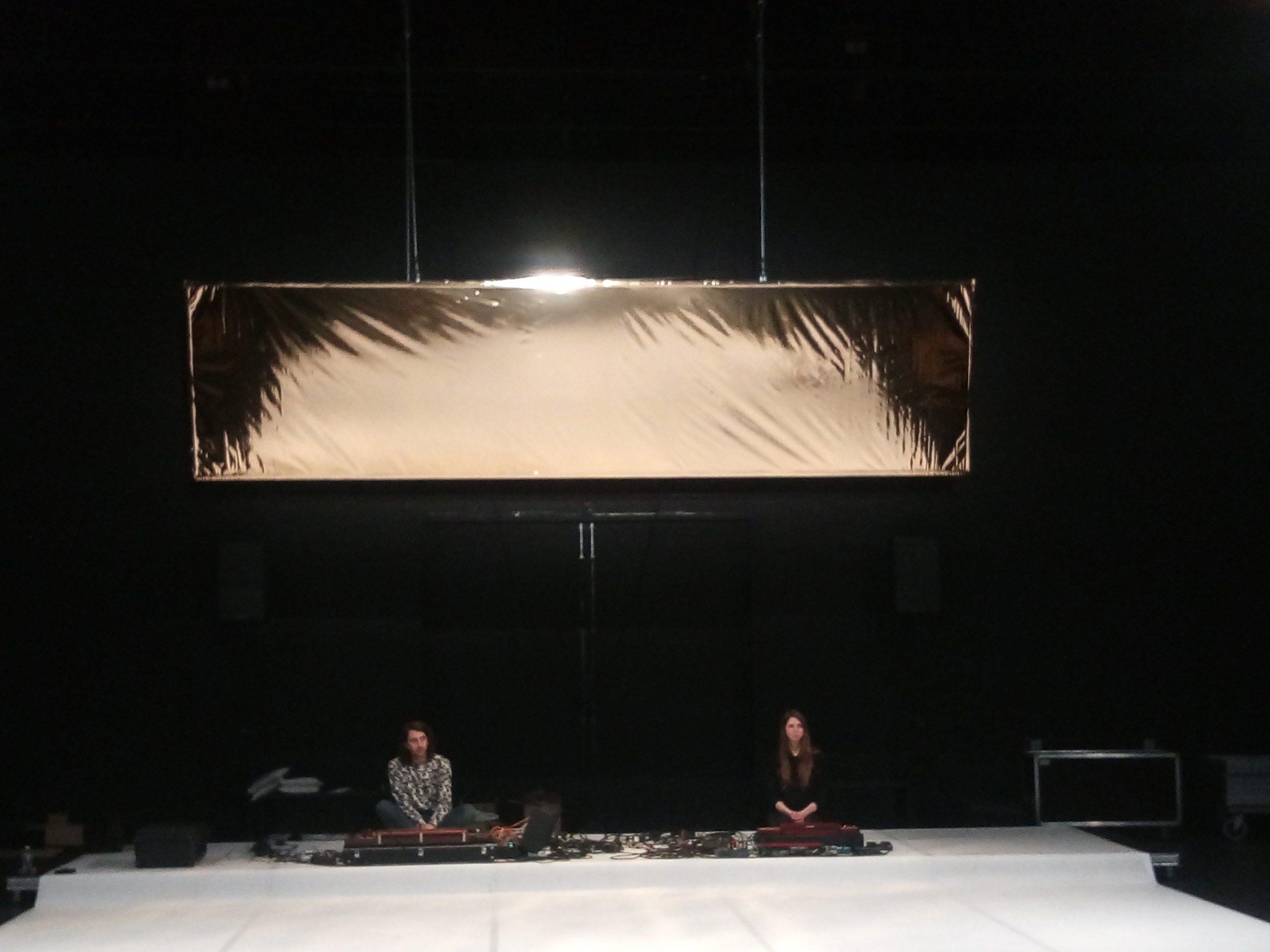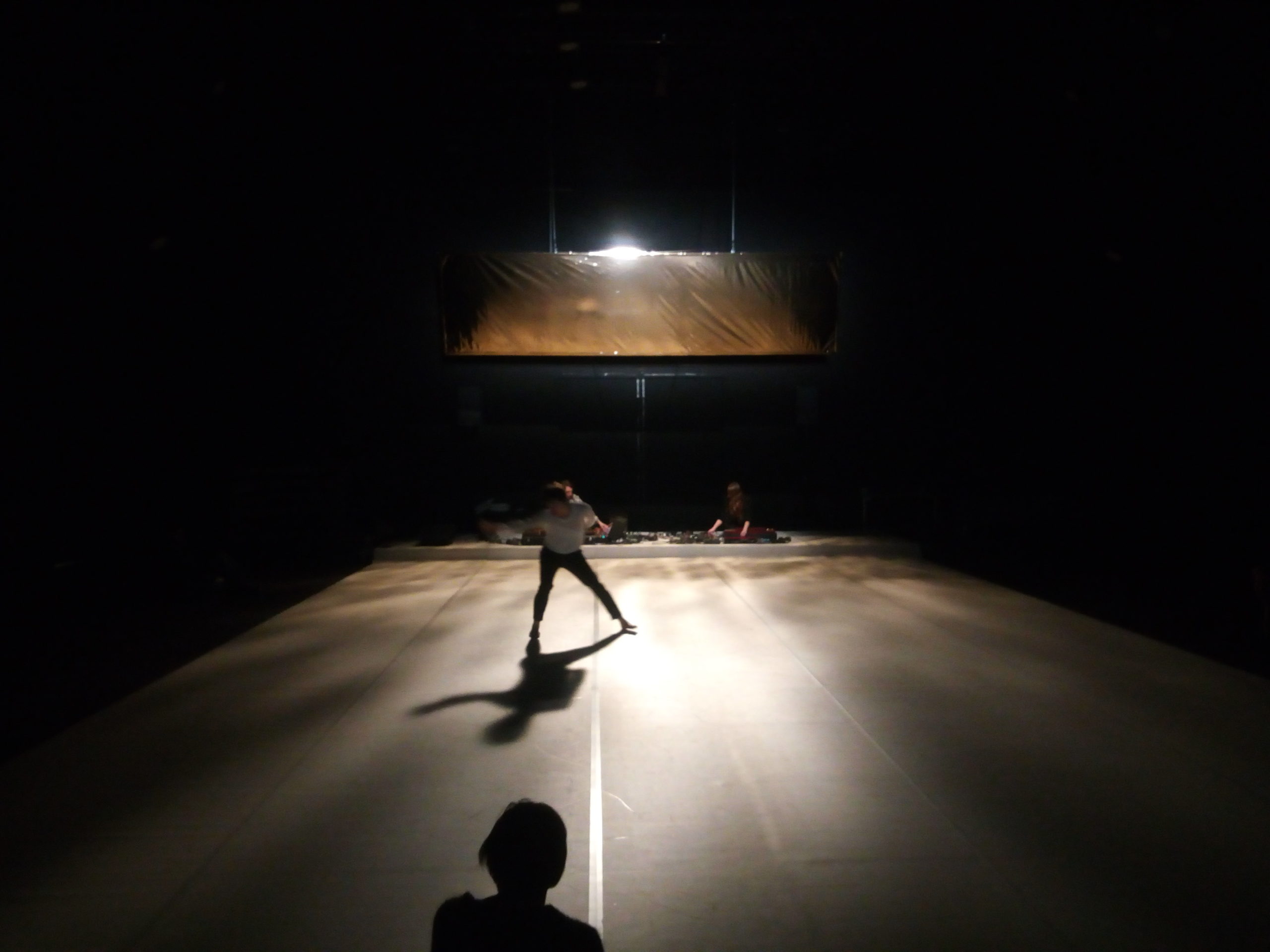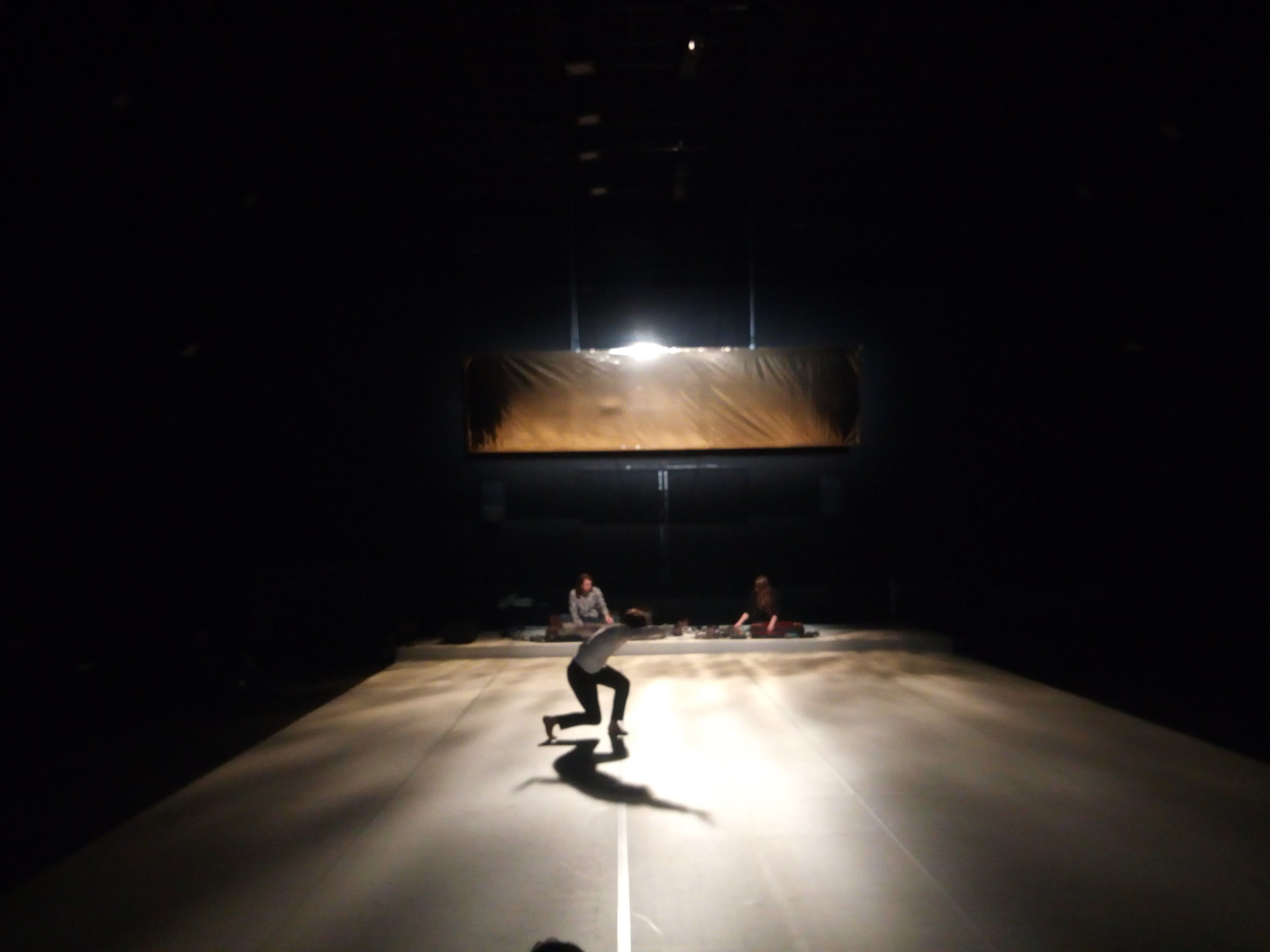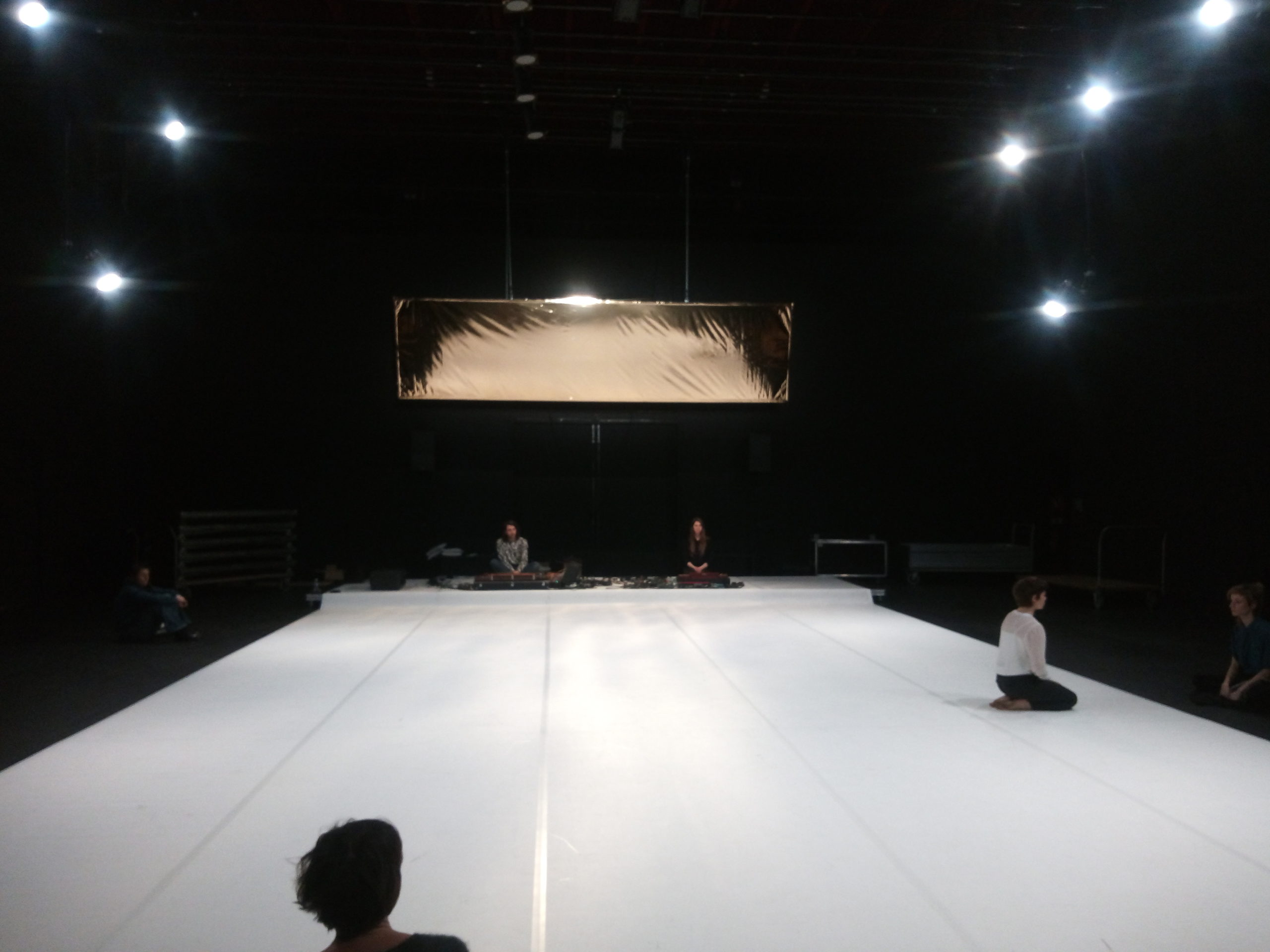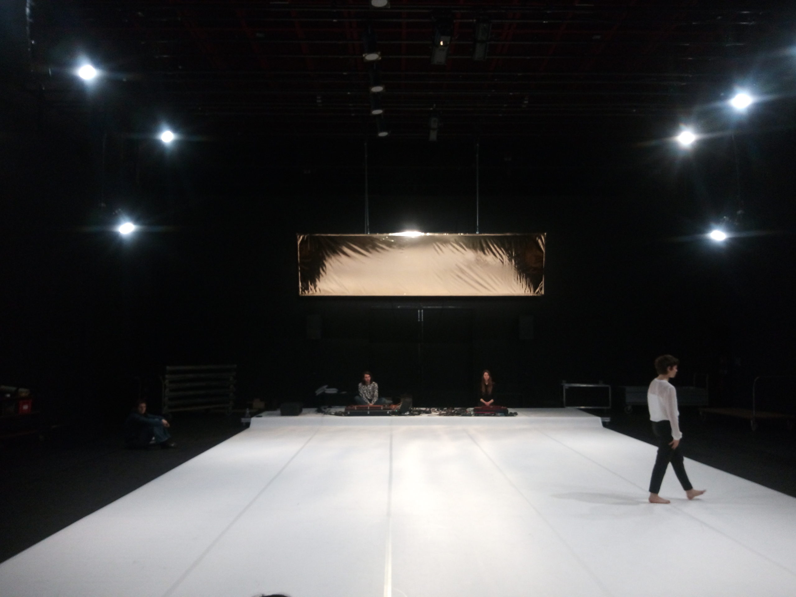 Trio pour une danseuse et deux musiciens, La Maladresse est un sentiment précieux, un moment délicat. Le chant de Célia Gondol perle comme des gouttes d’une eau fraîche et claire dans un espace ritualisé – étendue blanche, assises noires, large feuille d’or suspendue. De ce chant japonais qui monte du ventre, elle déploie une danse qui nous est adressée avec une grande douceur. La danseuse a compilé et agencé un important vocabulaire gestuel pour en délivrer un précipité tout en bras ondulants, colonne serpentine et tête toujours mobile. Elle est traversée et laisse passer images, sensations, sentiments. Sa danse minimale vit alors qu’enfle depuis le fond de scène un typhon musical porté par les deux musiciens-chamanes du groupe Cercueil / Puce Moment. La puissance tellurique du son envahit l’atmosphère et chasse la danseuse pour laisser place à une vacance du geste, un instant de communion. Dans l’écriture de Mylène Benoit la musique, la danse, la lumière, les couleurs coexistent à une importance égale pour créer une proposition chorégraphique. Avec La Maladresse elle livre une pièce concentrée et sensible, colorée par le voyage au Japon effectué par l’équipe, qui a infusé une délicatesse venue équilibrer les mouvements dysfonctionnels et involontaires qui étaient la matière de départ de ce trio là.