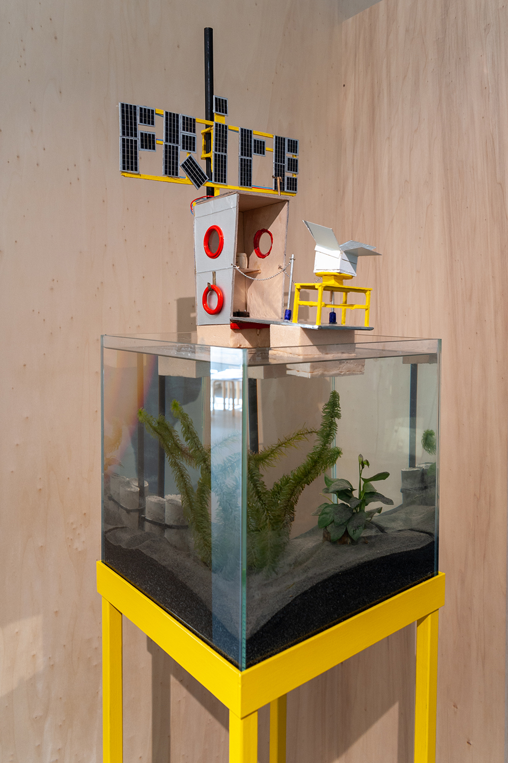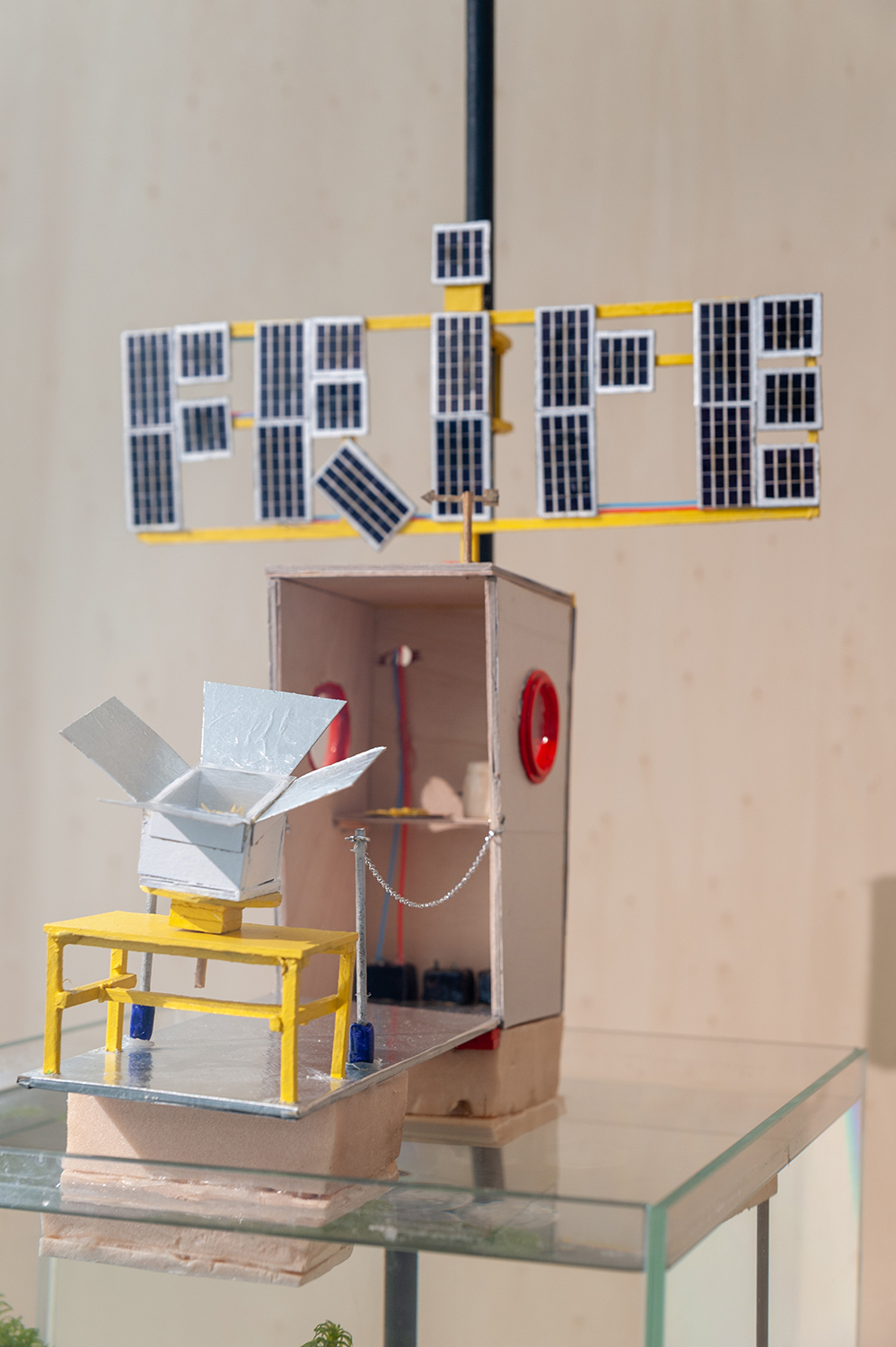 S’apparentant à une cabine de bateau de pêche, l’architecture sans architecte imaginée par Philémon Vanorlé est une friterie marémotrice et ascensionnelle capable de se maintenir hors de l’eau. Avec humour l’artiste questionne le phénomène bien réel de la montée des eaux : comment l’homme pourra maintenir une civilisation, un rapport à la terre et à la fertilité, s’il n’est plus sur terre ? Quelles sont ses chances de survie si la production de frites dépend de l’énergie produite par les panneaux solaires – qui sont aussi l’enseigne de la friterie ?
