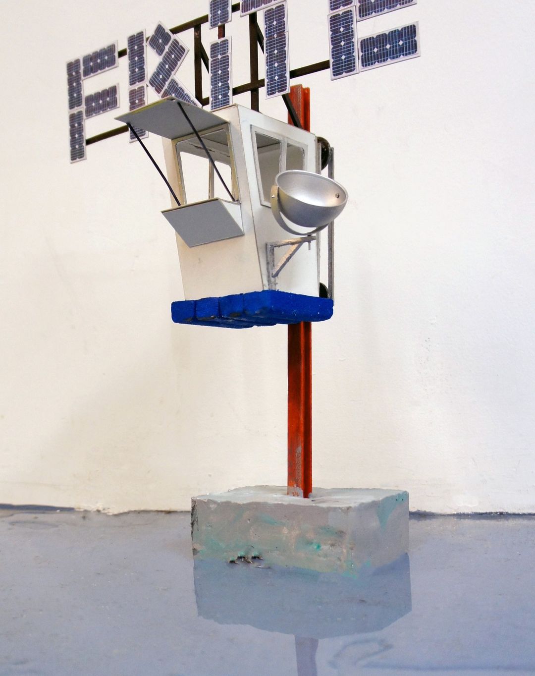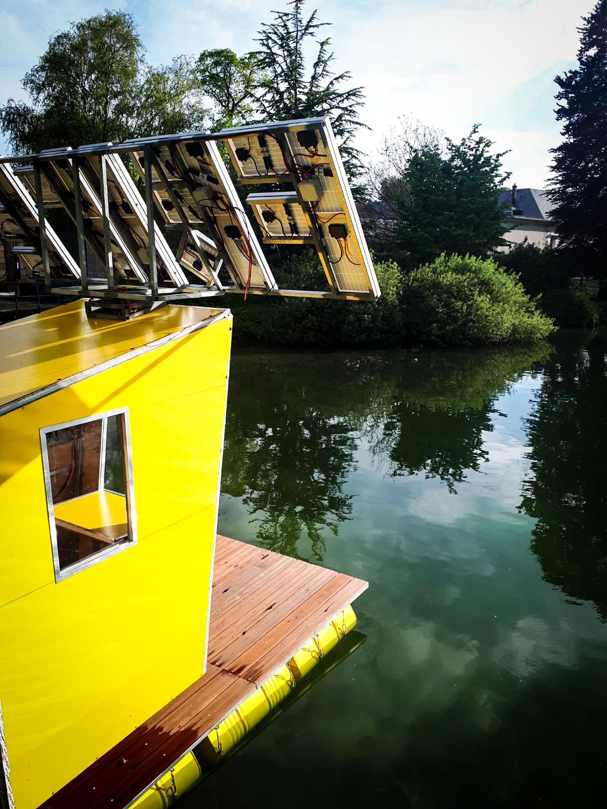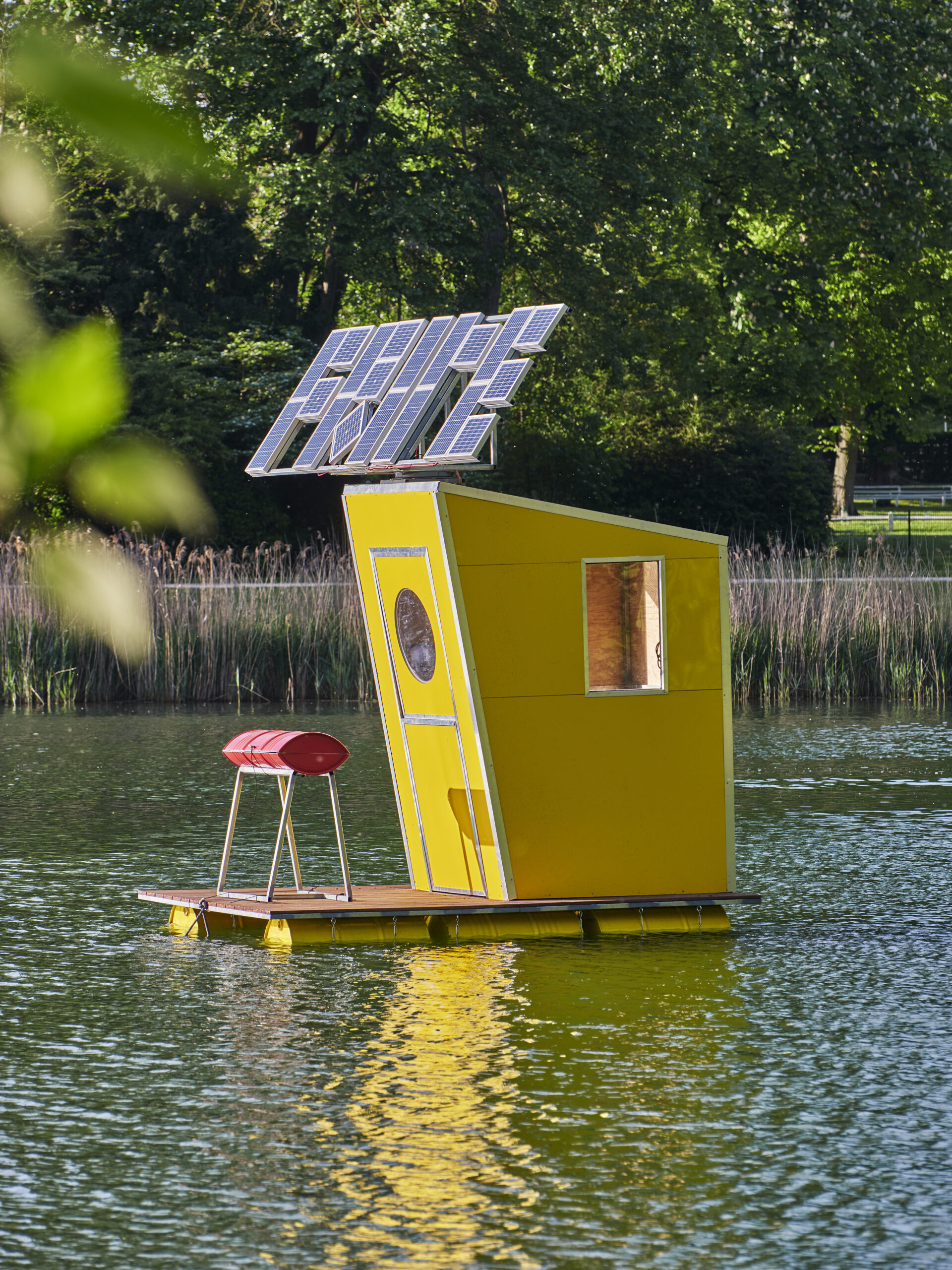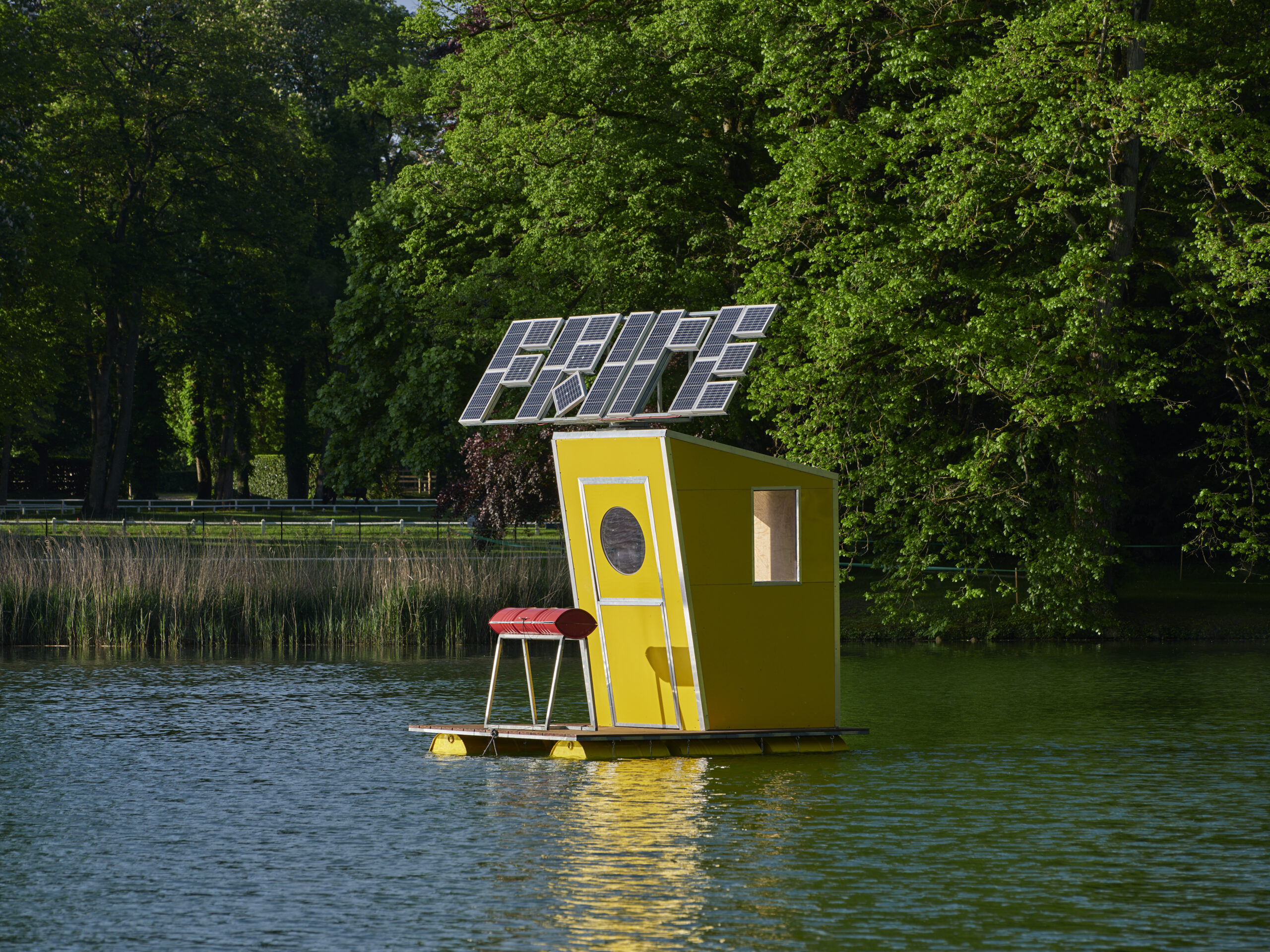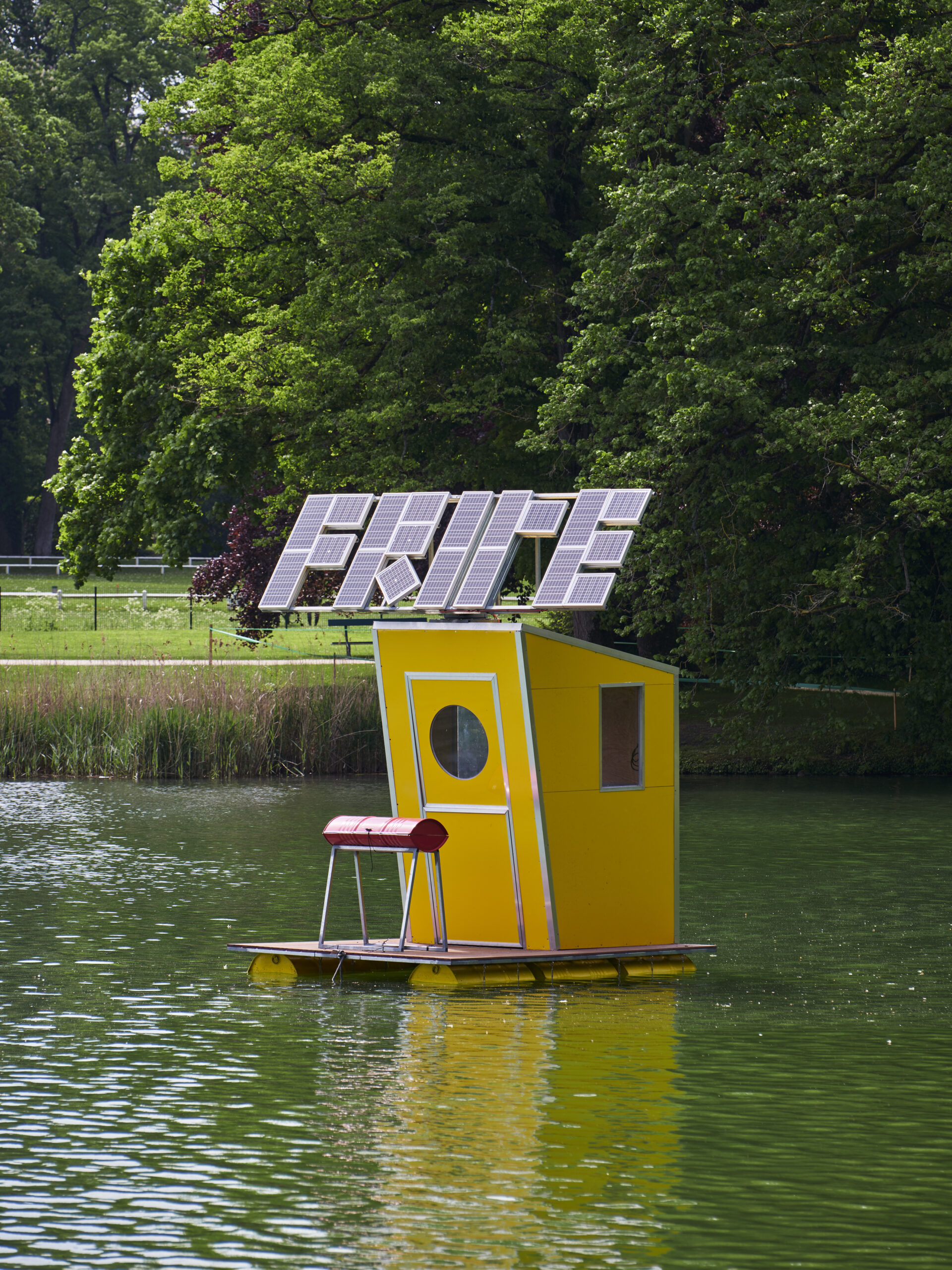 S’apparentant à une cabine de bateau de pêche, l’architecture sans architecte imaginée par Philémon Vanorlé est une friterie marémotrice et ascensionnelle capable de se maintenir hors de l’eau. Avec humour l’artiste questionne le phénomène bien réel de la montée des eaux : comment l’homme pourra maintenir une civilisation, un rapport à la terre et à la fertilité, s’il n’est plus sur terre ? Quelles sont ses chances de survie si la production de frites dépend de l’énergie produite par les panneaux solaires – qui sont aussi l’enseigne de la friterie ?