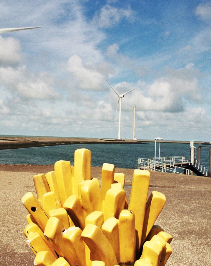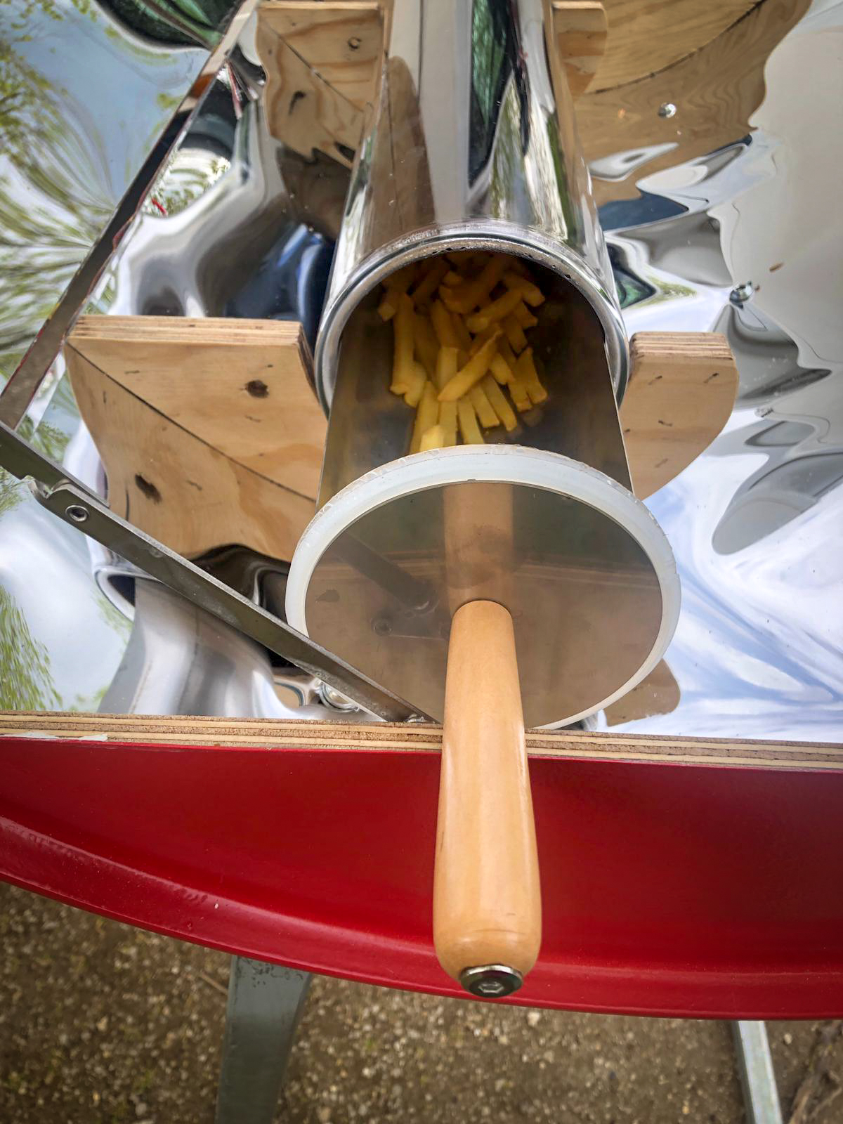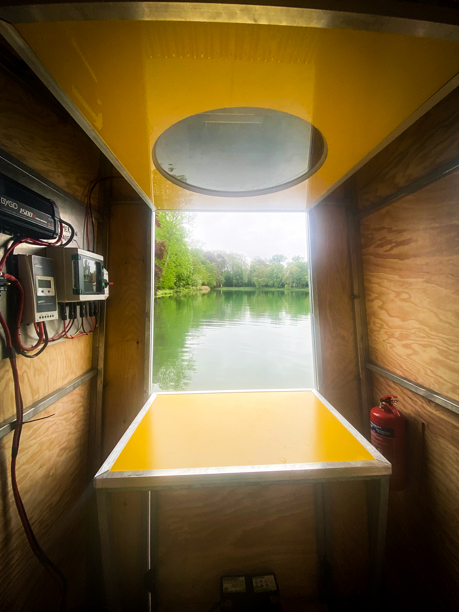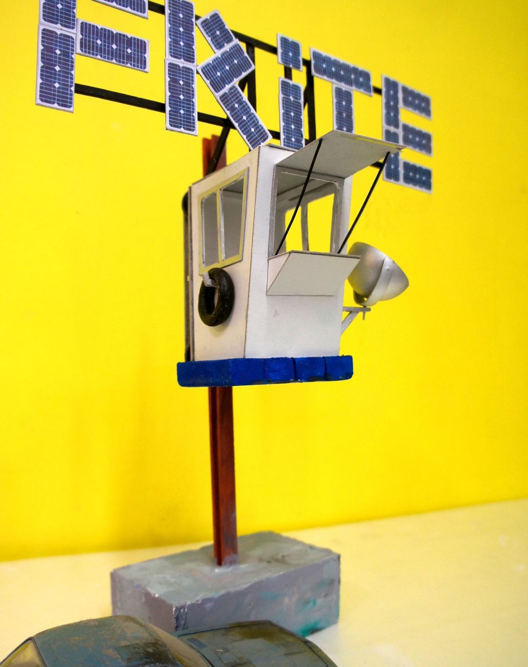 S’apparentant à une cabine de bateau de pêche, l’architecture sans architecte imaginée par Philémon Vanorlé est une friterie marémotrice et ascensionnelle capable de se maintenir hors de l’eau. Avec humour l’artiste questionne le phénomène bien réel de la montée des eaux : comment l’homme pourra maintenir une civilisation, un rapport à la terre et à la fertilité, s’il n’est plus sur terre ? Quelles sont ses chances de survie si la production de frites dépend de l’énergie produite par les panneaux solaires – qui sont aussi l’enseigne de la friterie ?