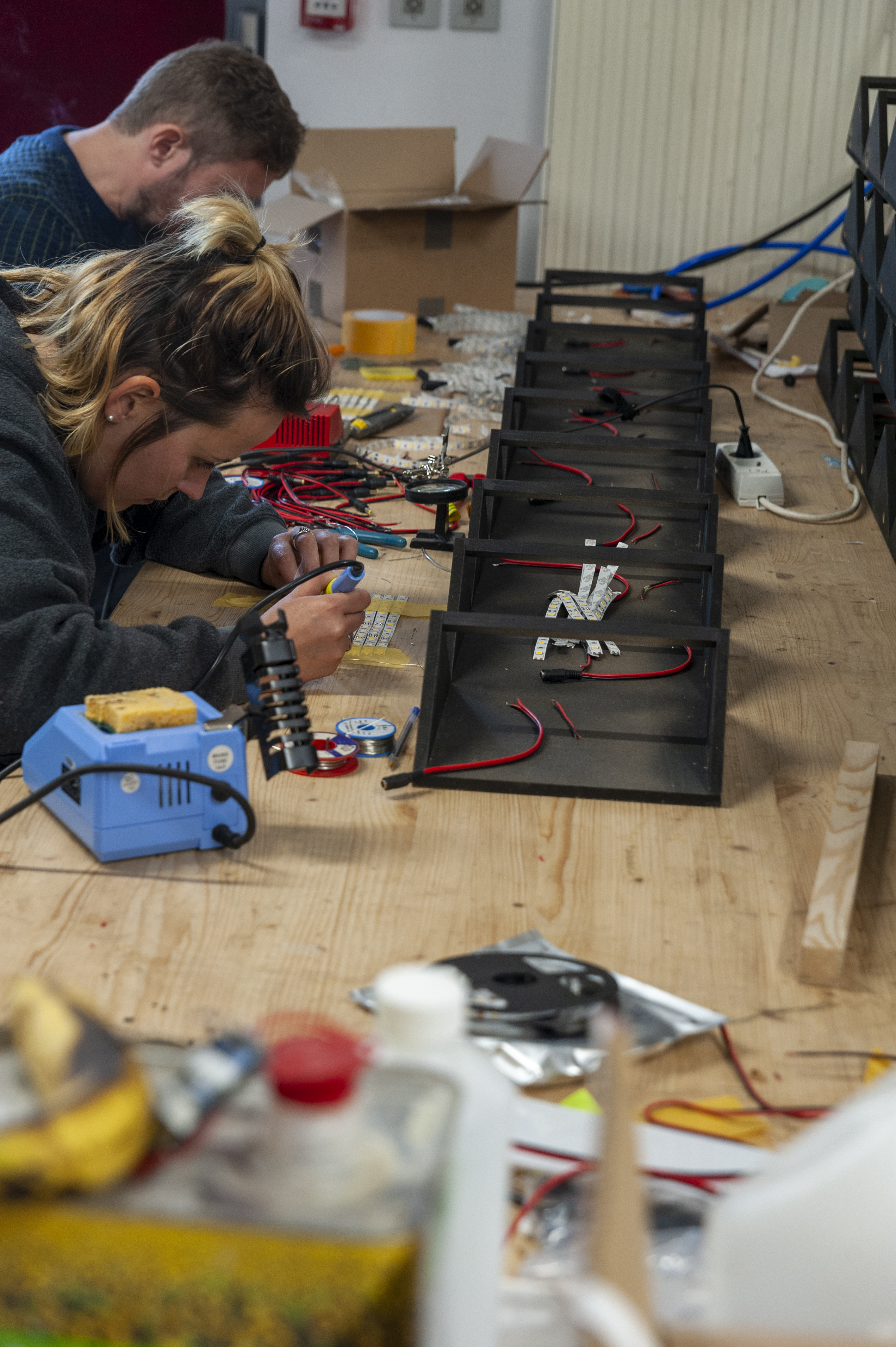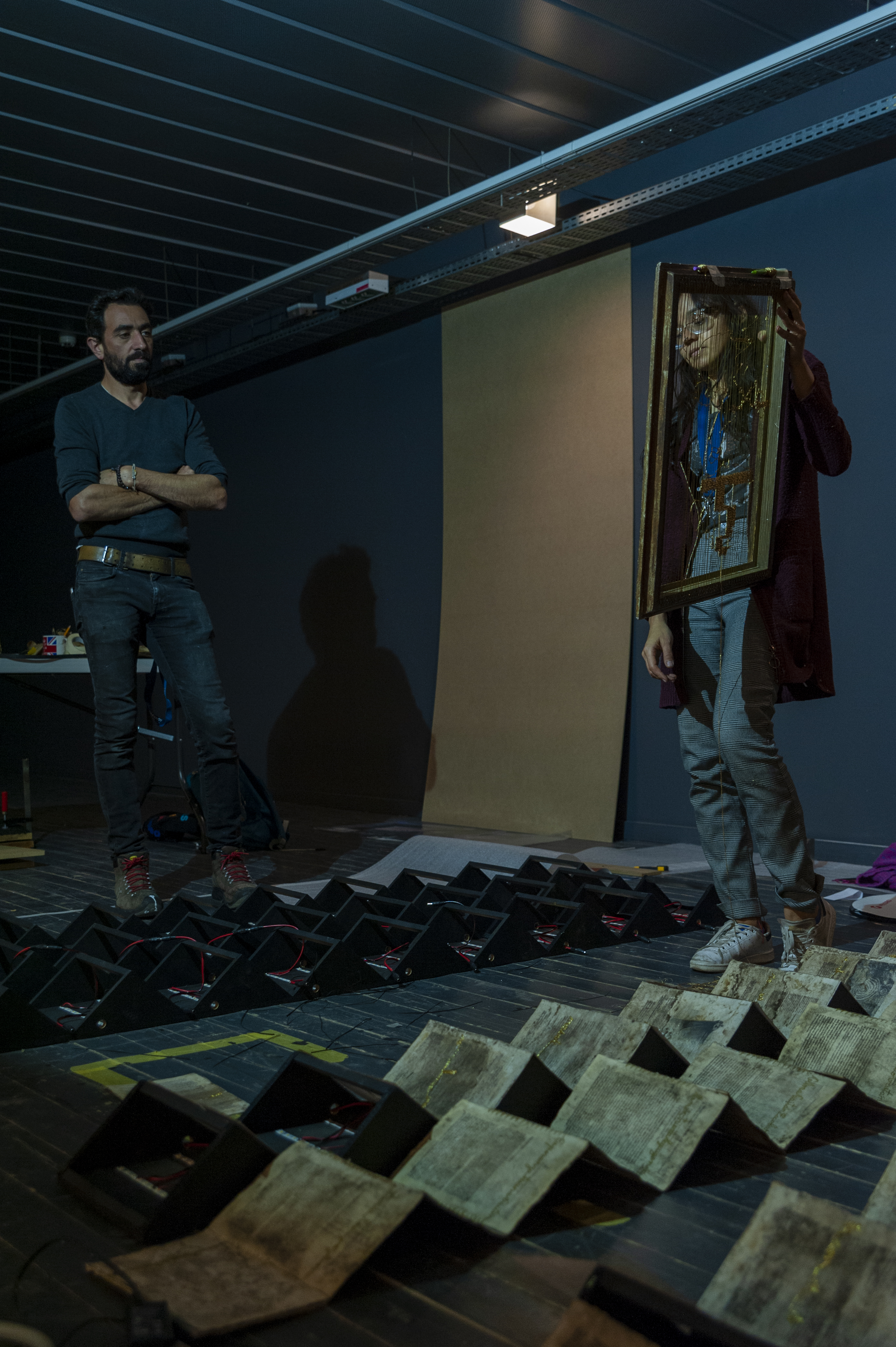 Une chanson composée par l’artiste accompagne chacun de ces noms: ainsi lorsqu’une chanson résonne, le nom correspondant s’illumine. Sur toutes ces pages, il y a un « Tunjo », une figure tissée faite par l’artiste en guise d’offrande aux dieux afin de demander la guérison de cet héritage.