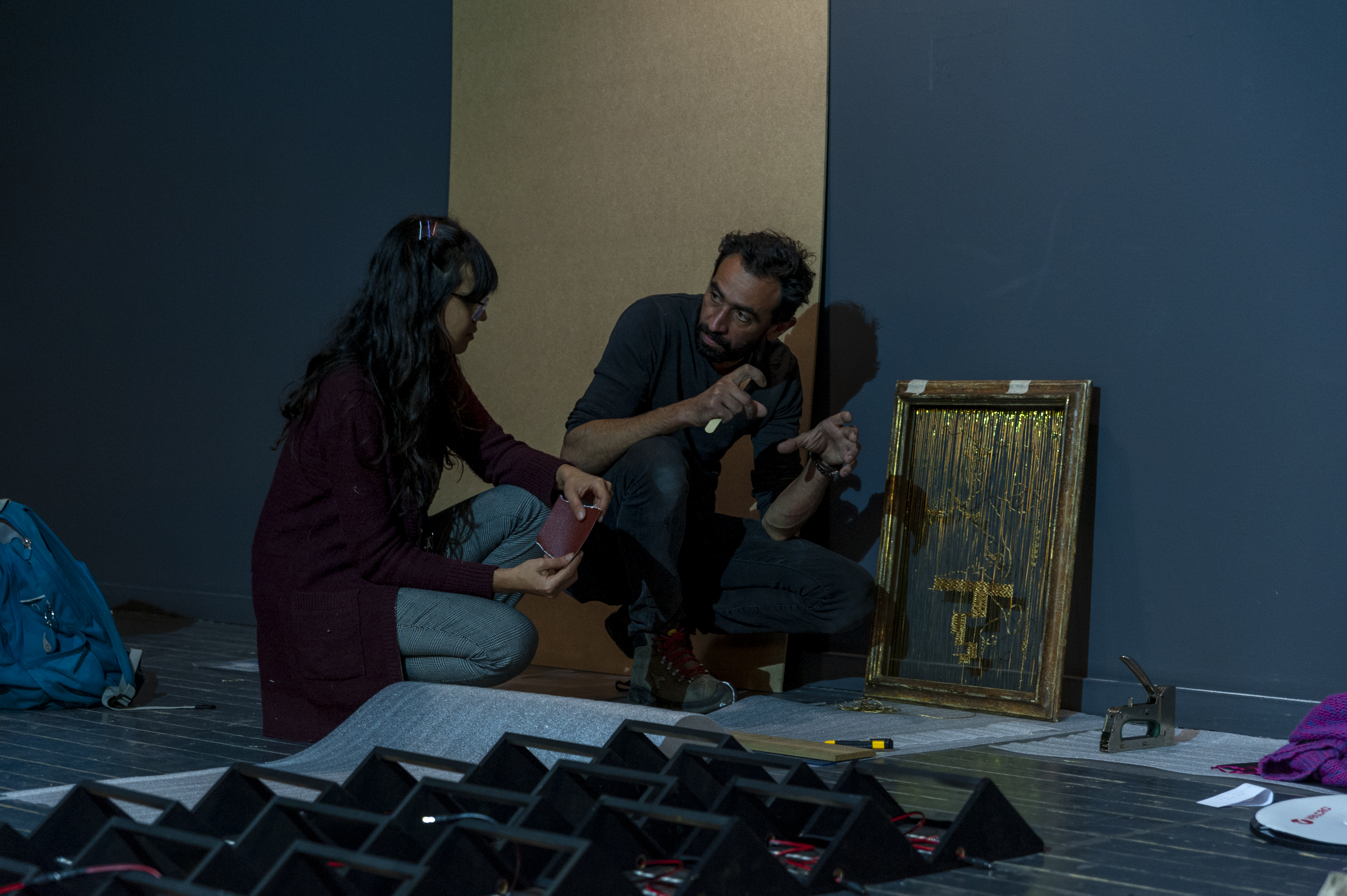 Dans l’installation Resiliencia (Résilience), l’artiste Camila Rodríguez Triana crée un rituel de guérison de cet héritage, rituel dans lequel elle tente de retrouver cette sagesse ancestrale perdue qui, pour elle, habite chaque homme et chaque femme latino-américain d’une manière inconsciente. Tout d’abord, l’artiste a transformé des pages de livres sur la colonisation de l’Amérique écrites du point de vue des colons : elle les a peintes avec de la terre et de la boue puis a brodé les noms de ses ancêtres avec du fil d’or. Ces noms se décomposent en leurs phonèmes pour passer d’un langage humain à un langage de symboles divins.