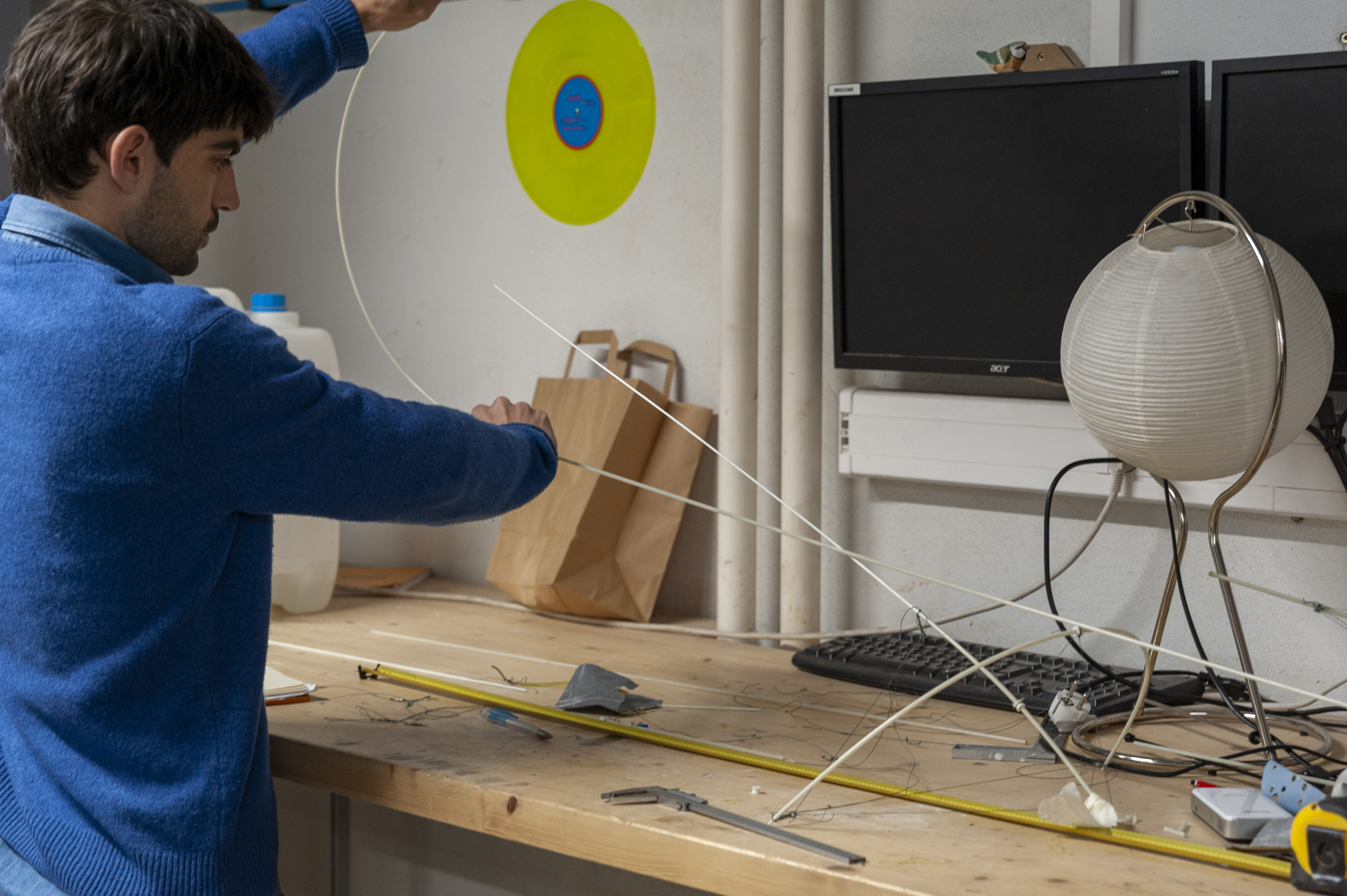 Aux côtés de différents prototypes conçus en impression 3D avec Filippo Broggini et d’images en mouvement générées par le système K A N O puis mises en espace dans un dispositif d’écran courbe, l’agence accueille sur l’un de ses plateaux des sphères de Cantor, objets curieux de mathématique et de mécanique développés par Nicolas Grollier de Servière au xviie siècle. L’agencement des différentes formes sur les surfaces du meuble tripode nous renvoie à un même principe commun: le désir de construction. Le bureau expose ici un programme créatif, une combinaison possible, à la croisée des champs, des techniques et des époques.