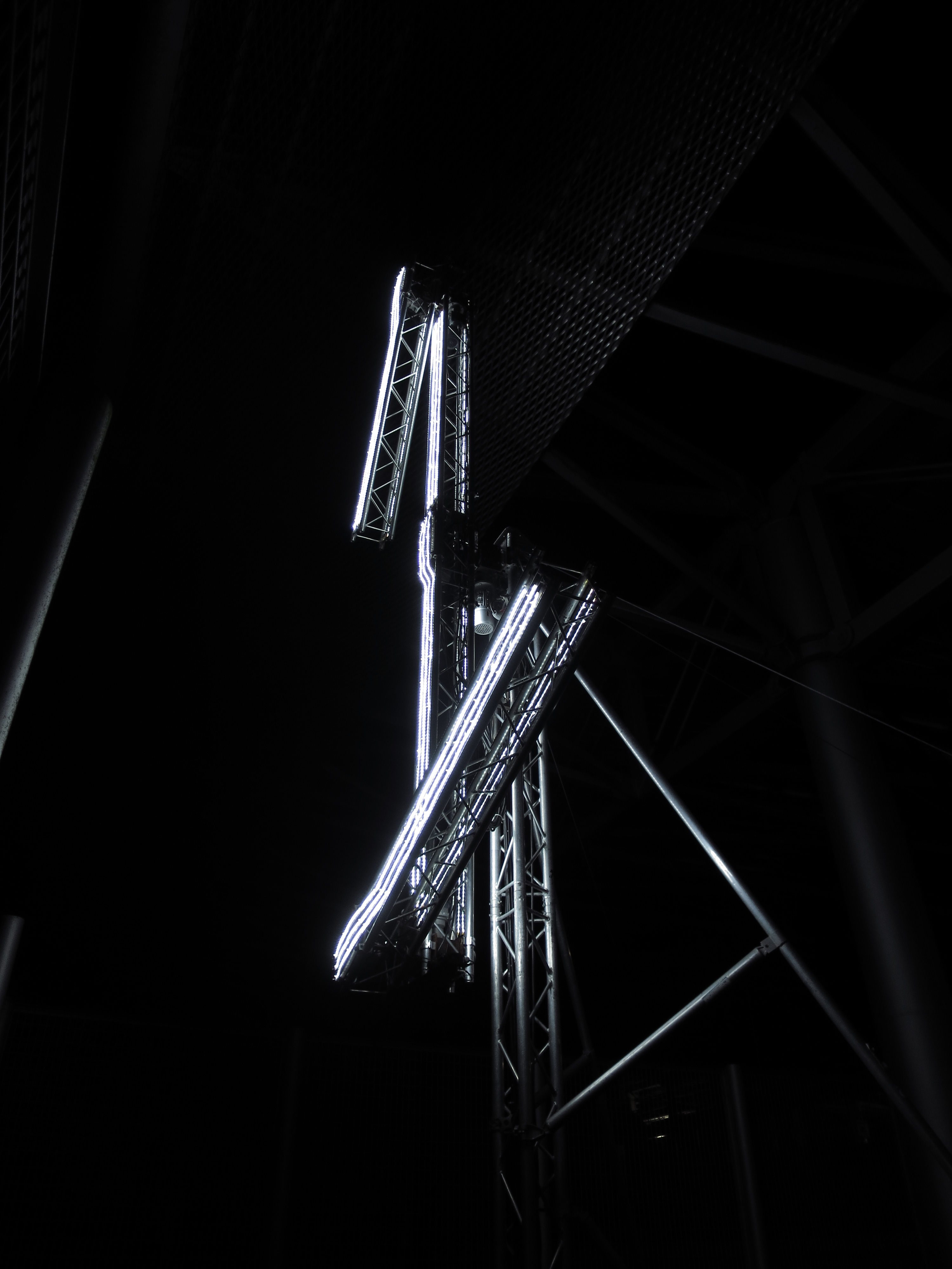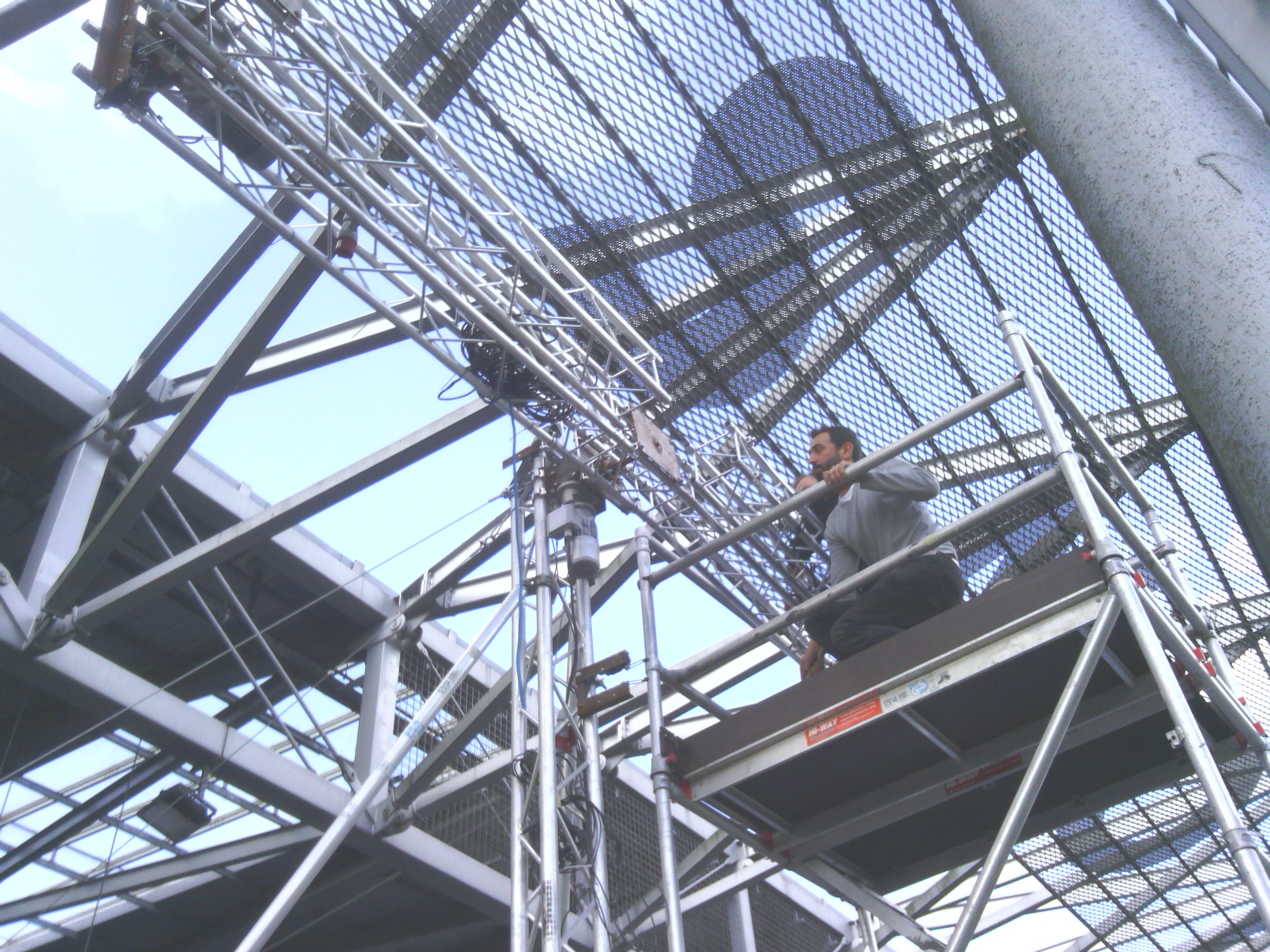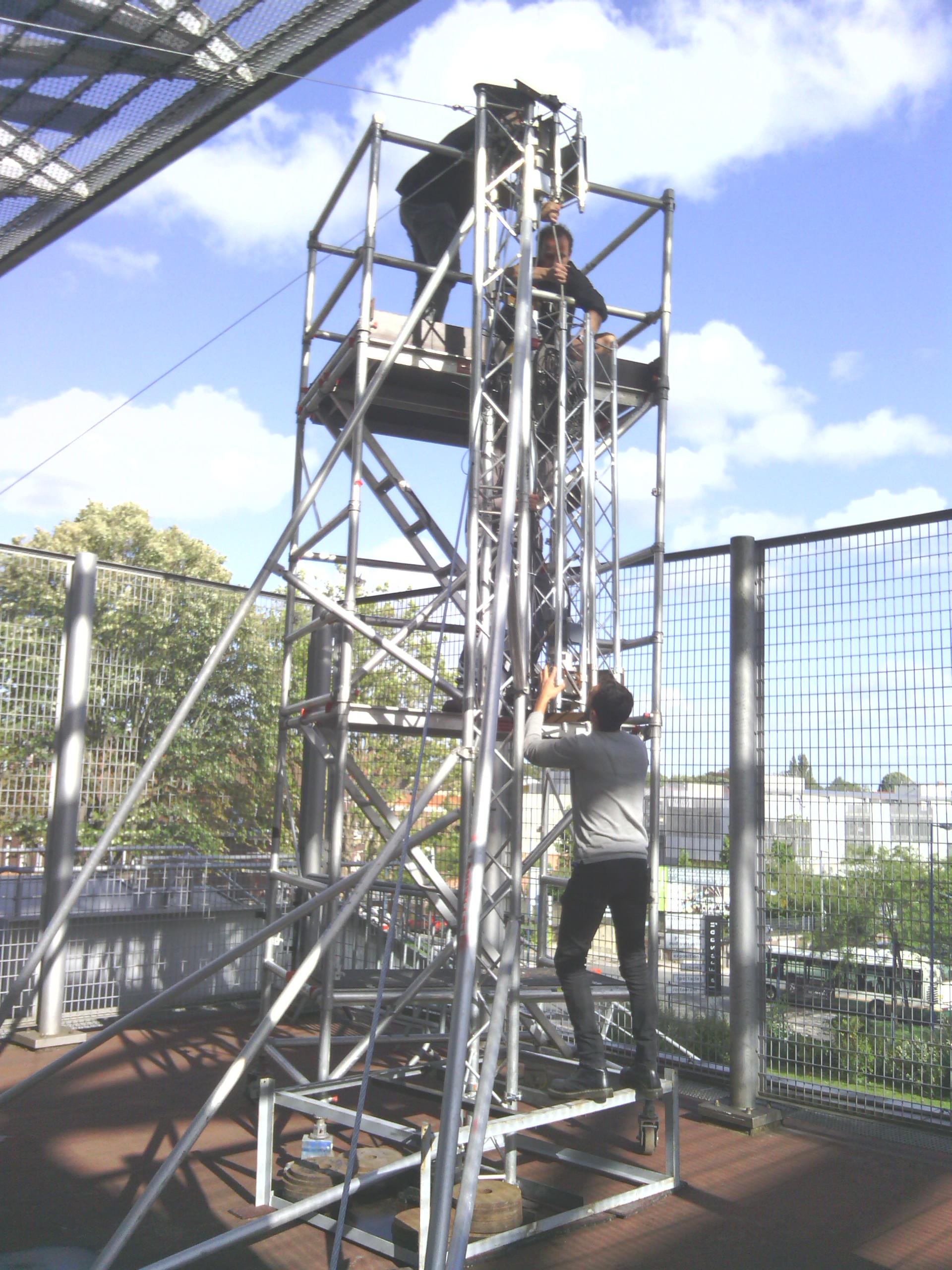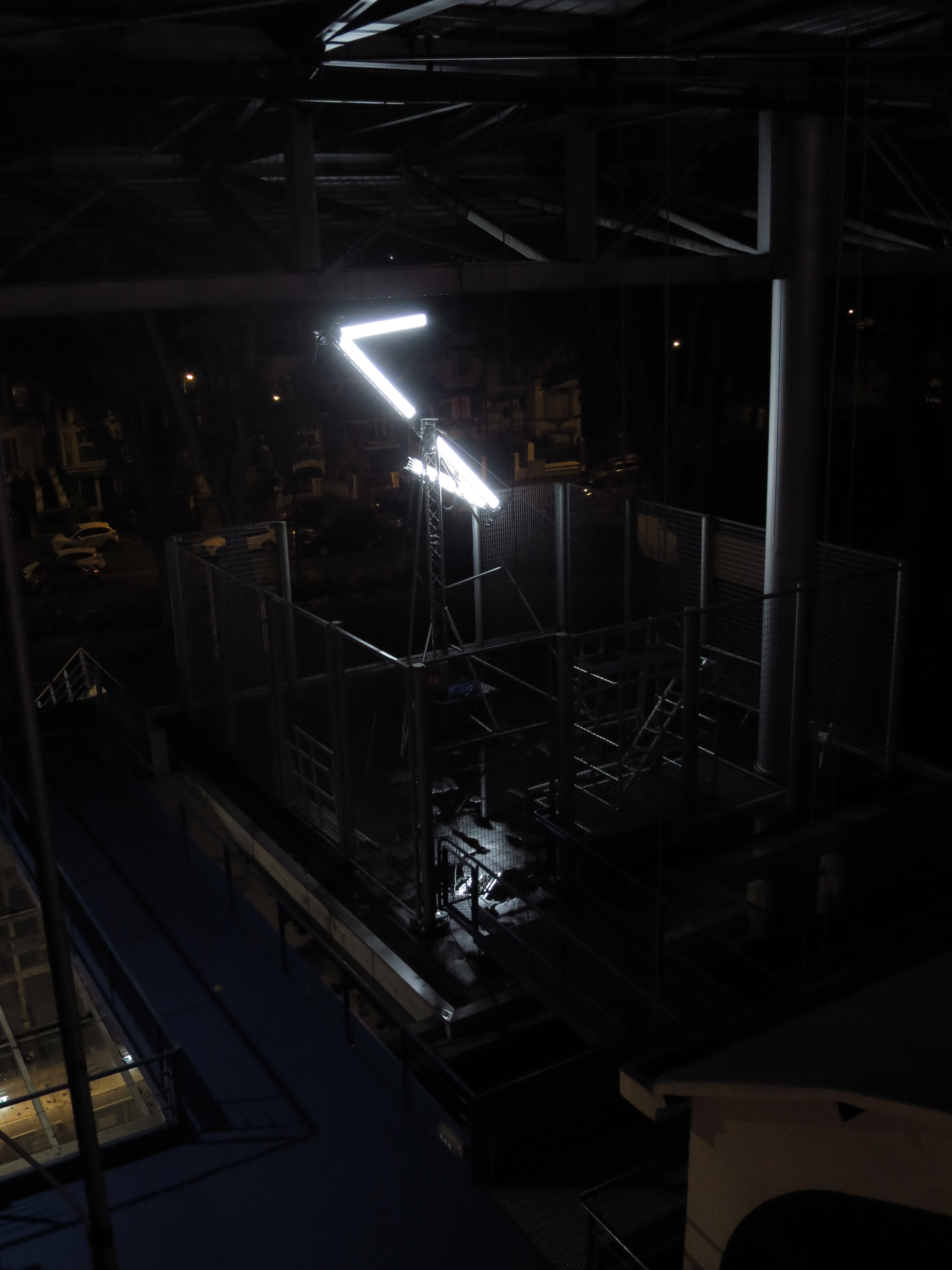 La rencontre entre le spectateur et le télégraphe se fait en deux étapes. Ce sont deux expériences bien distinctes. La première est celle d’un objet cinétique lumineux positionné dans le voisinage immédiat de l’exposition. On le regarde depuis l’une des passerelles aériennes situées sous le toit du Fresnoy. Depuis cette perspective, l’objet donné à voir reste mystérieux, illisible dans sa fonction. Il persiste à composer toute une série de mouvements. Certains semblent faire signe et se répètent comme si une tentative de communication avait été initiée par le télégraphe. La nuit il devient lumineux et continue à se balancer. De ce point de vue on pourrait penser à un manège à sensations. Le sémaphore a été placé sur un toit de la ville, celui de l’Imaginarium, afin de souligner le lien qu’il entretenait avec l’horizon et la perspective de la ville. Une fois rentré dans l’exposition le visiteur aura accès au sens caché de cette machine posée dans le paysage. Face à lui, une série d’écrans qui décryptent en temps réel les messages transmis par le télégraphe. Ce dernier est visible lui aussi depuis une retransmission vidéo. Au fur et à mesure que les signes sont mimés par le sémaphore, les traductions apparaissent en sous-titre un peu à la façon d’un film en VO. S’il le souhaite, le visiteur peut influer sur la composition des messages diffusés. Une tablette tactile l’accompagne dans le choix du contenu à envoyer. Une fois la rédaction du message terminé, il peut assister à sa transmission en temps réel par le télégraphe. Les messages composés par les précédents visiteurs sont aussi visibles. Par la suite ils composeront un registre et se substitueront à ceux que les aléas de l’histoire ont fait disparaître.